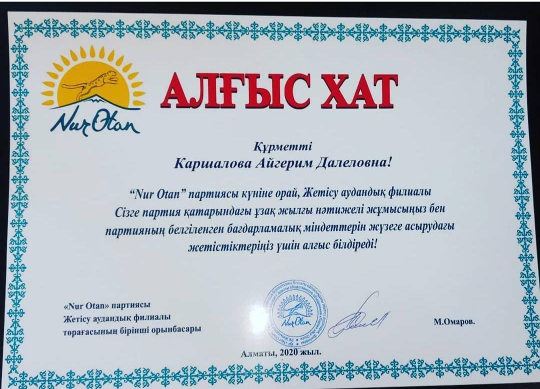 "Nur Otan" партиясы күніне орай, Жетісу аудандық филиалы #103 мектеп-гимназиясының директорының тәрбие ісі жөніндегі орынбасары Каршалова Айгерим Далеловнаны партия қатарындағы ұзақ жылғы нәтижелі жұмысы мен партияның белгіленген бағларламалық міндеттерін жүзеге асырудағы жетістіктері үшін алғыс білдіріп арнайы партияның Алғыс хатымен марапаттады. Еңбегіңіз бағаланып,биіктен көріне беруіңізге тілектеспіз!