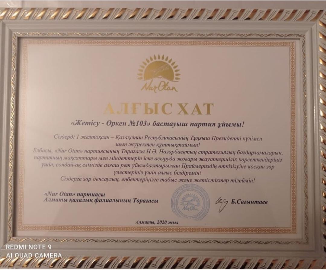 «Nur Otan» партиясы Жетісу аудандық филиалында Қазақстан Республикасының Тұңғыш Президенті күніне орай партияға жаңа мүшелерді қабылдау жәнеЖетісу аудандық филиалының төрағасы Б. Сағынтаевтың атынан Алғыс хаттар табыстау салтанатты кеші өтті. » КГУ "Школа-гимназия №103" Управления образования г.Алматы