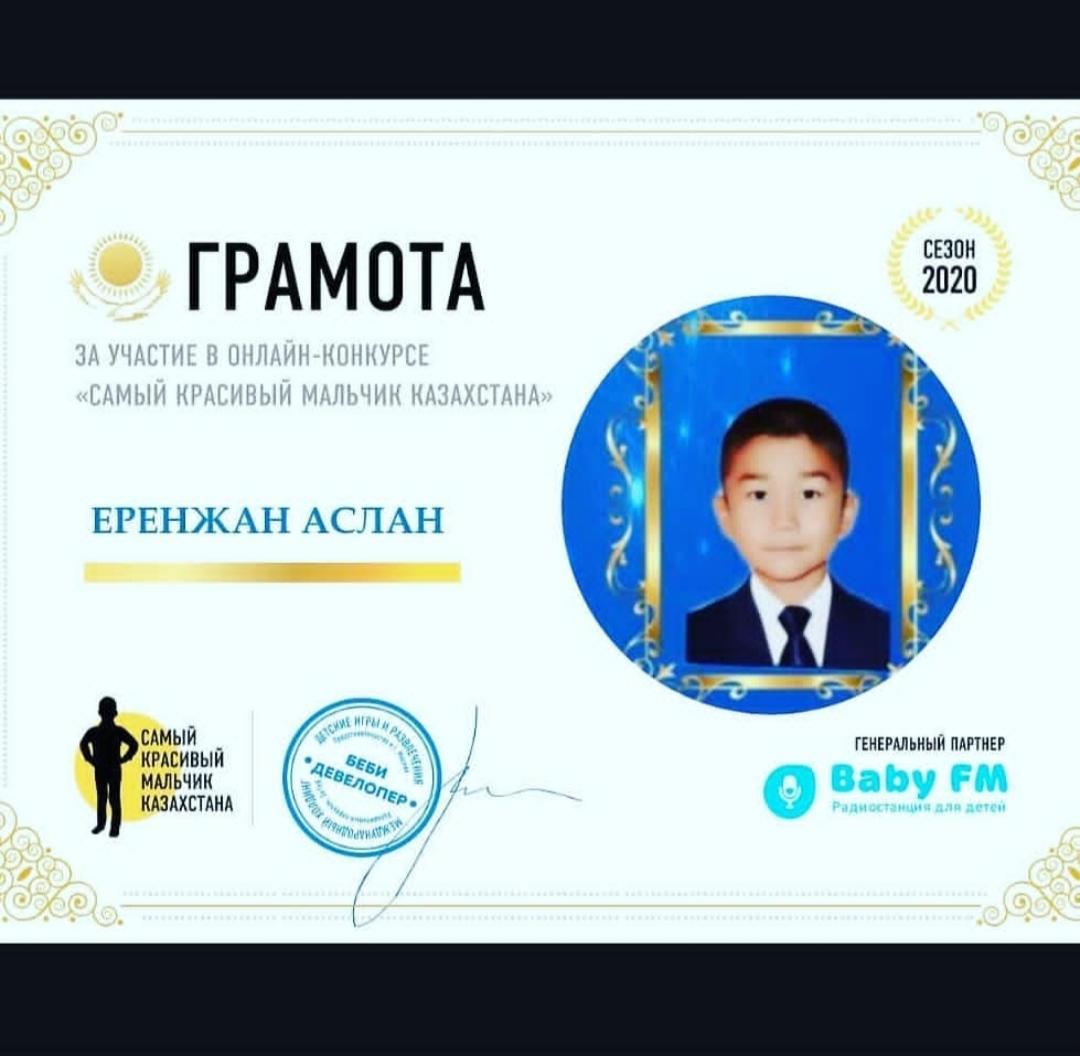 20 қараша 2020 0 1 2 3 4 5 Награждается ГРАМОТОЙ ученик 1" Ә" класса ЕРЕНЖАН АСЛАН за участие в онлайн-конкурсе "САМЫЙ КРАСИВЫЙ МАЛЬЧИК КАЗАХСТАНА".