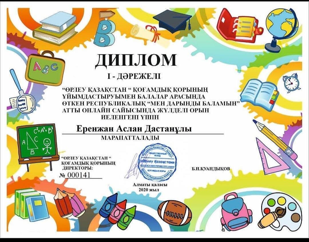 рлеу Қазақстан”-Қоғамдық қорының ұйымдастыруымен балалар арасында өткен Республикалық “Мен дарынды баламын”атты онлайн сайысында 1 “Ә” сынып оқушысы Еренжан Аслан Дастанұлы жүлделі орын алып, І дәрежелі дипломмен марапатталған болатын.