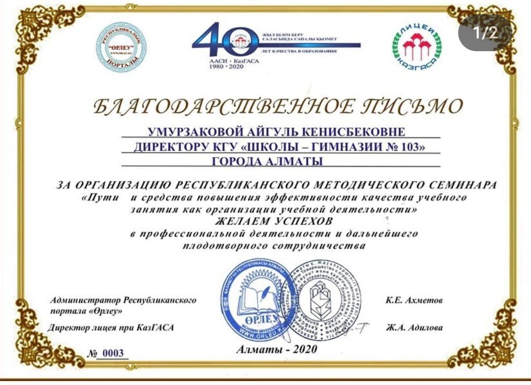 06 қаңтар 2021 0 1 2 3 4 5 БЛАГОДАРСТВЕННОЕ ПИСЬМО УМУРЗАКОВОЙ АЙГУЛЬ КЕНИСБЕКОВНЕ ДИРЕКТОРУ КГУ «ШКОЛЫ – ГИМНАЗИИ № 103» ЗА ОРГАНИЗАЦИЮ РЕСПУБЛИКАНСКОГО МЕТОДИЧЕСКОГО СЕМИНАРА