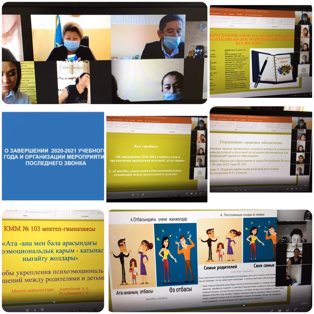 Қазақстан Республикасының Білім және ғылым министрлігінің, Алматы қаласы Білім басқармасының жоспарына сәйкес 2020-2021 оқу жылының аяқталуын ұйымдастыру мақсатында Жалпыреспубликалық ата-аналар жиналысы өтті. » КГУ "Школа-гимназия №103" Управления образования г.Алматы