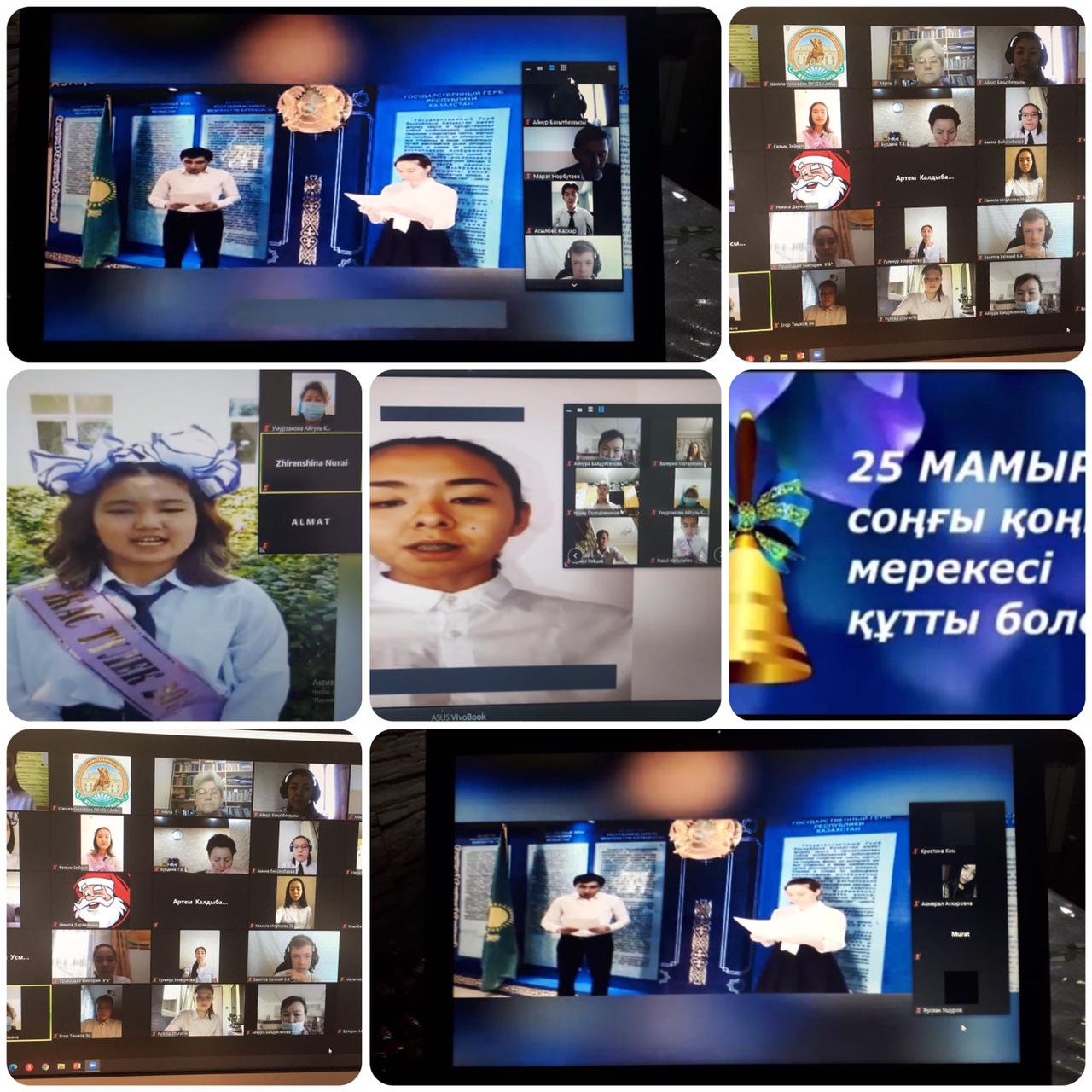 КГУ "Школа-гимназия №103" Управления образования г.Алматы » Ақпарат » Бүгін қызығы мен қиыншылығы мол, әр оқу жылы қайталанбас тарихқа толы мектептің мерекесі. №103 мектеп-гимназиясында 9-11- сынып оқушылары арасында «Сыңғырла, соңғы қоңырау» тақырыбында онлайн зум платформасында соңғы қоңырау аталып өтті.