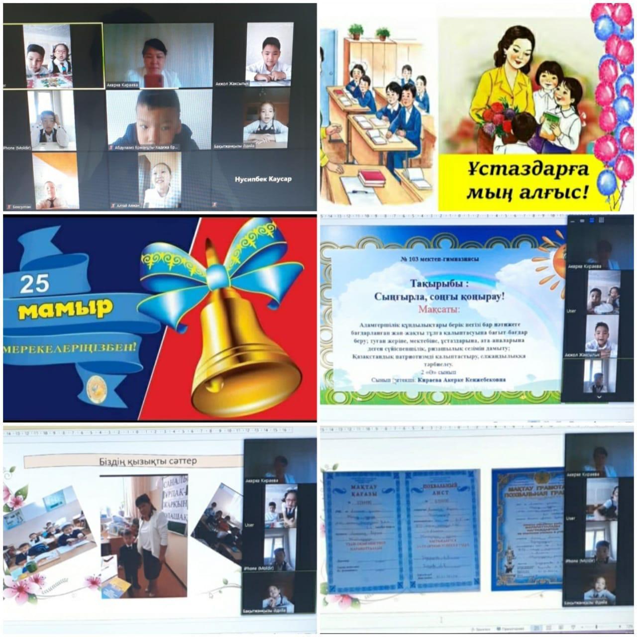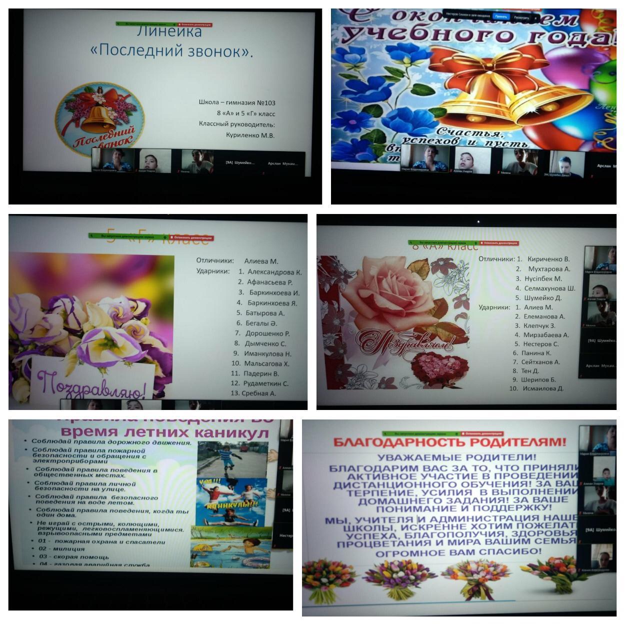 Пандемия кезінде қашықтан оқу форматына байланысты Алматы қаласы Жетісу ауданы №103 мектеп-гимназиясында 2020-2021 оқу жылының 25-мамыр "Сыңғырла ,соңғы қоңырау" атты соңғы қоңырау салтанаты 1-11 сыныптар үшін онлайн форматта ұйымдастырылды.
