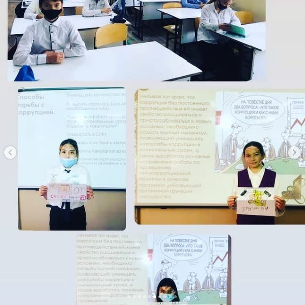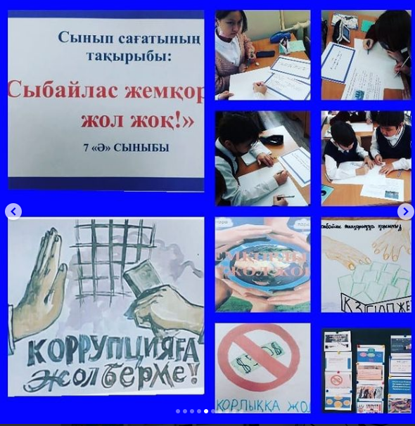 Жетісу ауданы Білім бөлімінің тапсырмасына сәйкес және 103 мектеп-гимназияның оқу-тәрбие жоспары негізінде 2-11 сыныптар аралығында "Жемқорлыққа жол жоқ!" тақырыбында сынып сағаты