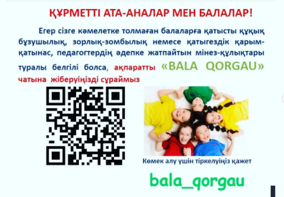 Министерство образования и науки Республики Казахстан совместно с ОО «Атамекенім» запускает проект « Bala Qorgau» по оказанию бесплатной консультационной помощи школьникам и их родителям –веб-сайт « bala qorgau».Более подробно ознакомиться с проектом можно на веб-сайте https://bala.gov.kz).
