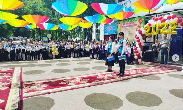 Салтанатты жиын "Күншуақ" домбыра ансамблінің қазақ халқының ұлттық аспабы домбырада ойналған күйден басталды. «Соңғы қоңырау» әнімен мектебіміздің озат оқушылары мен мектеп мақтаныштары ортаға шақырылды. Салтанатты жиынның алғашқы құттықтау сөзі мектеп директорының орынбасары Батырханова Үміт Көктеубаевнаға берілді. Биылғы оқу жылғы мектеп үздіктерін директордың ОІЖО және ДТІЖО Каршалова А.Д. марапаттады. Оқушыларымыз ән айтып, би билеп көңіл-күйлері жоғары дәрежеде болды. Ата-аналар өткізілген іс—шараға толасыз алғыстарын айтты.