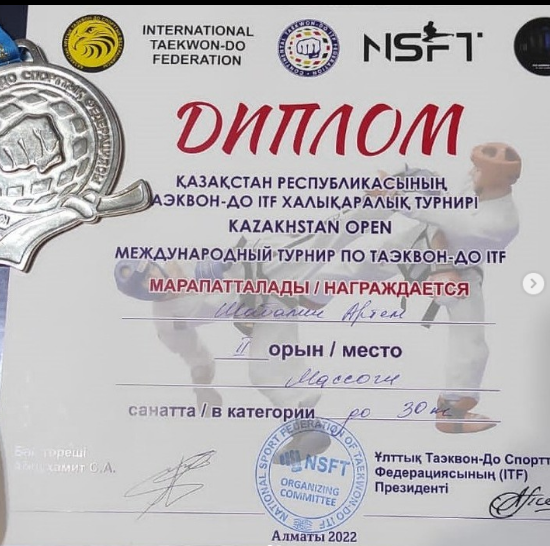 Шабалин Артем, ученик 6 В класса #103 школы-гимназии, принял участие в соревнованиях по таэквондо, организованной ко Дню Республики, и занял призовое второе место!