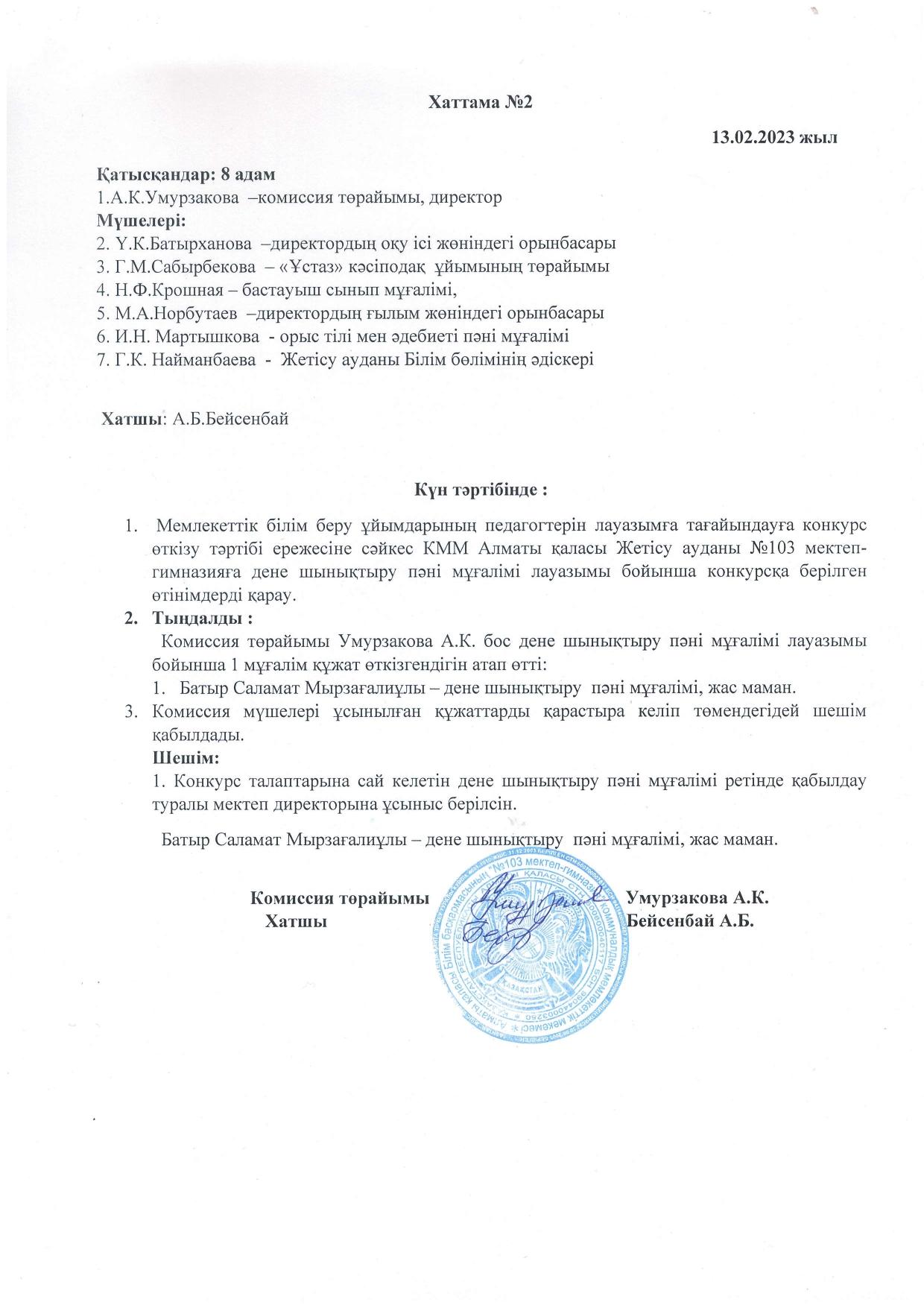 13 ақпан 2023 0 1 2 3 4 5 Хаттама №2 (педагоготарды лауазымға тағайындауға конкурс өткізу тәртібіне сәйкес)