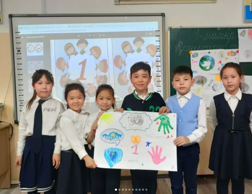 Жетісу ауданы #103 мектеп- гимназиясында 1 мамыр бірлік күніне арналған "Қазақ елі-ұлы достық мекені" тақырыбында 2"ә" сыныбында тәрбие сағаты өтті. Сынып жетекшісі: Сапанова Айдана Нұрқанатқызы