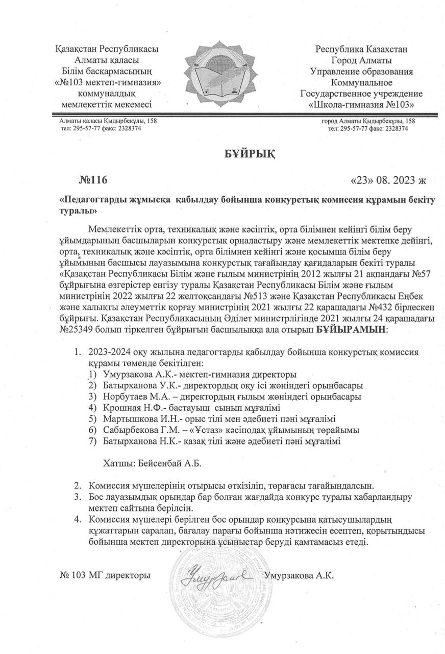 Бұйрық » КГУ "Школа-гимназия №103" Управления образования г.Алматы