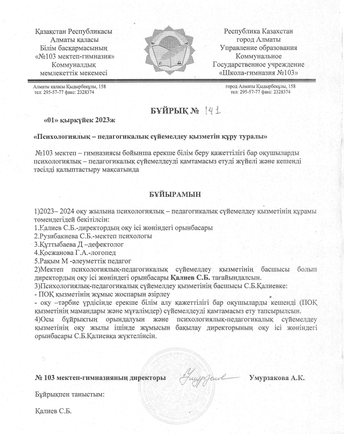 Психологиялық-педагогикалық сүйемелдеу қызметін құру туралы » КГУ "Школа-гимназия №103" Управления образования г.Алматы