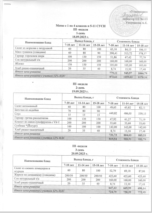 Ас мәзірі 20.09.2023 » КГУ "Школа-гимназия №103" Управления образования г.Алматы