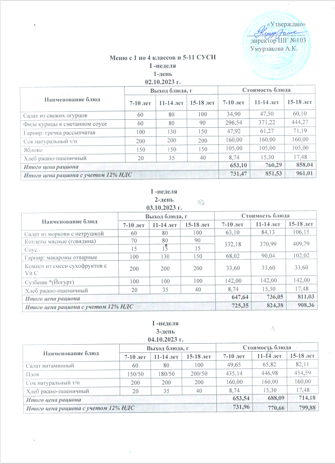 Ас мәзірі 04.10.2023 » КГУ "Школа-гимназия №103" Управления образования г.Алматы