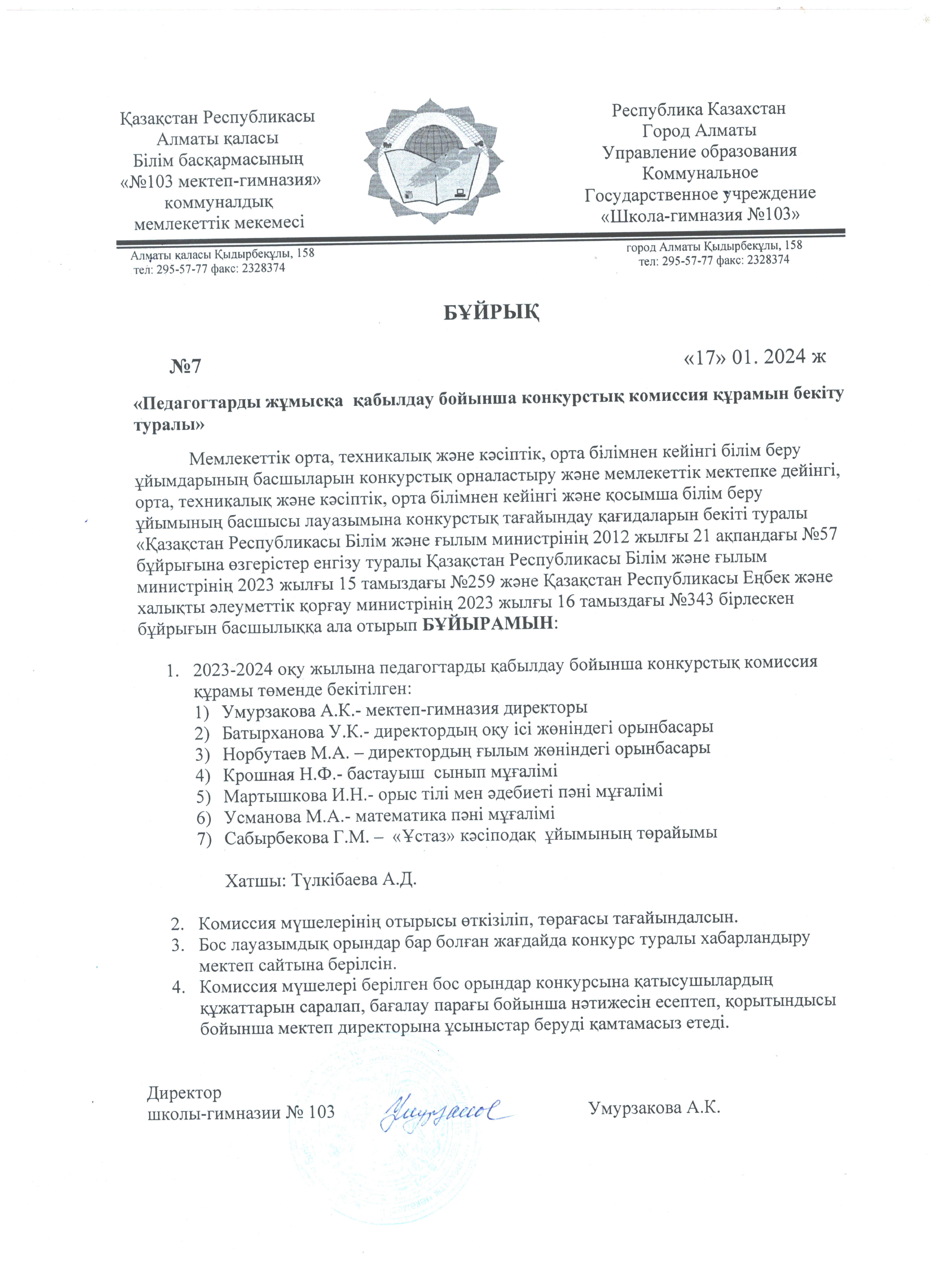 17 қаңтар 2024 0 1 2 3 4 5 Педагогтарды жұмысқа қабылдау бойынша конкурстық комиссия құрамын бекіту туралы бұйрық