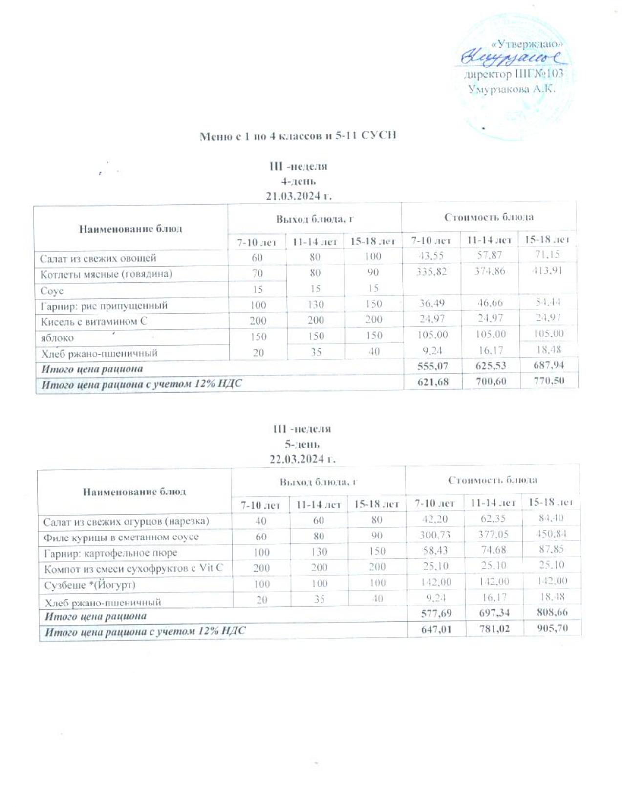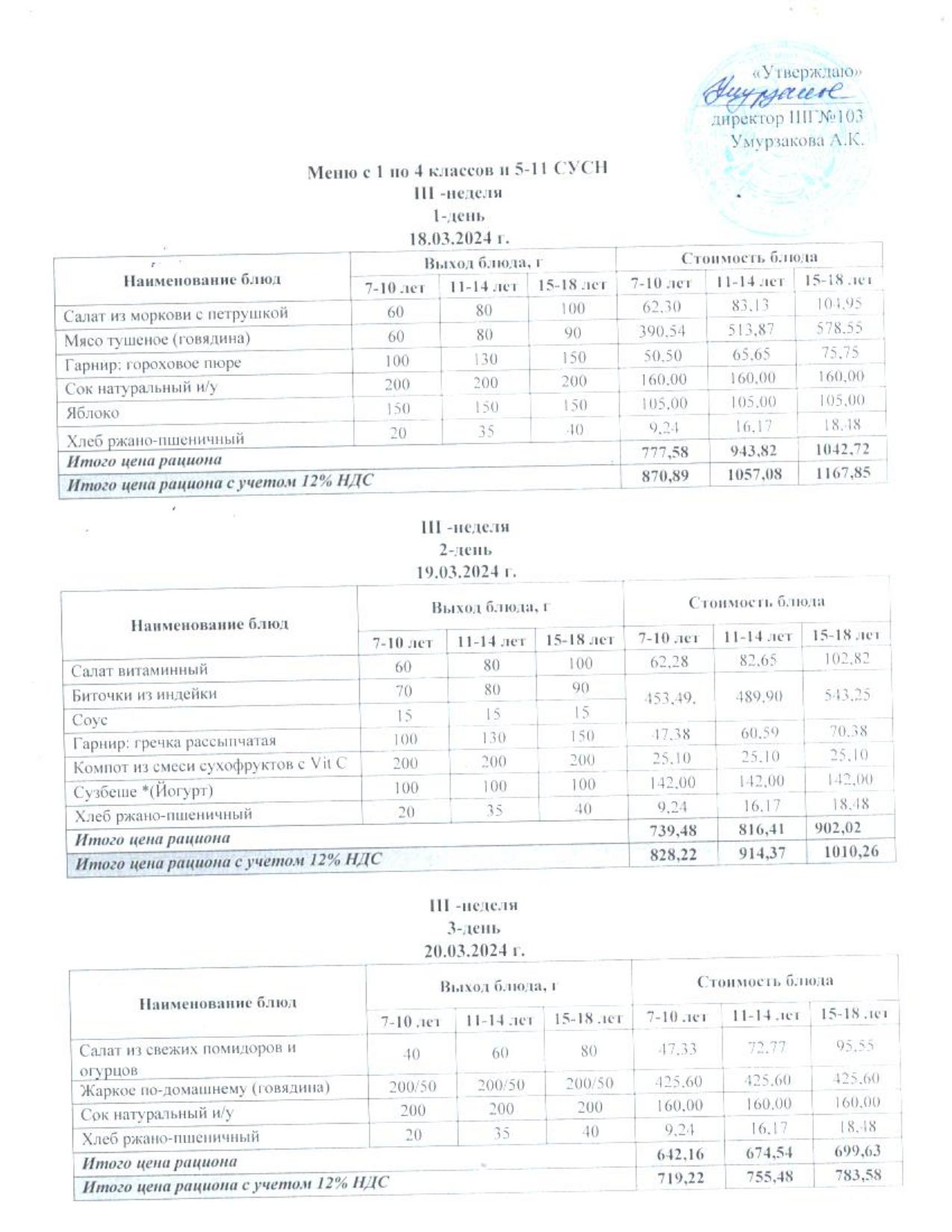 Тегін тамақтануға арналған 1 апталық ас мәзірі » КГУ "Школа-гимназия №103" Управления образования г.Алматы