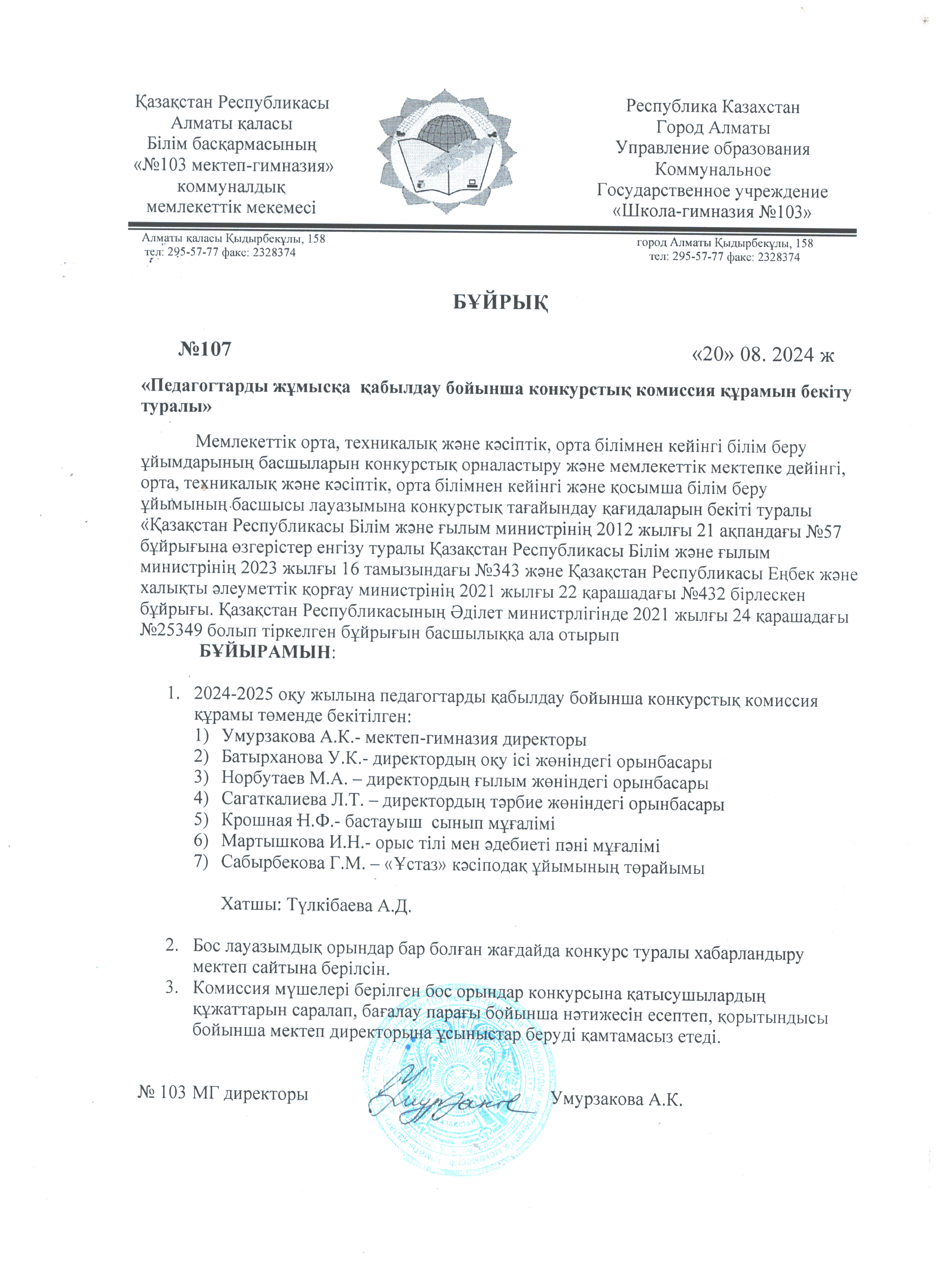 20 тамыз 2024 0 1 2 3 4 5 Педагогтарды жұмысқа қабылдау бойынша конкурстық комиссия құрамын бекіту туралы бұйрық