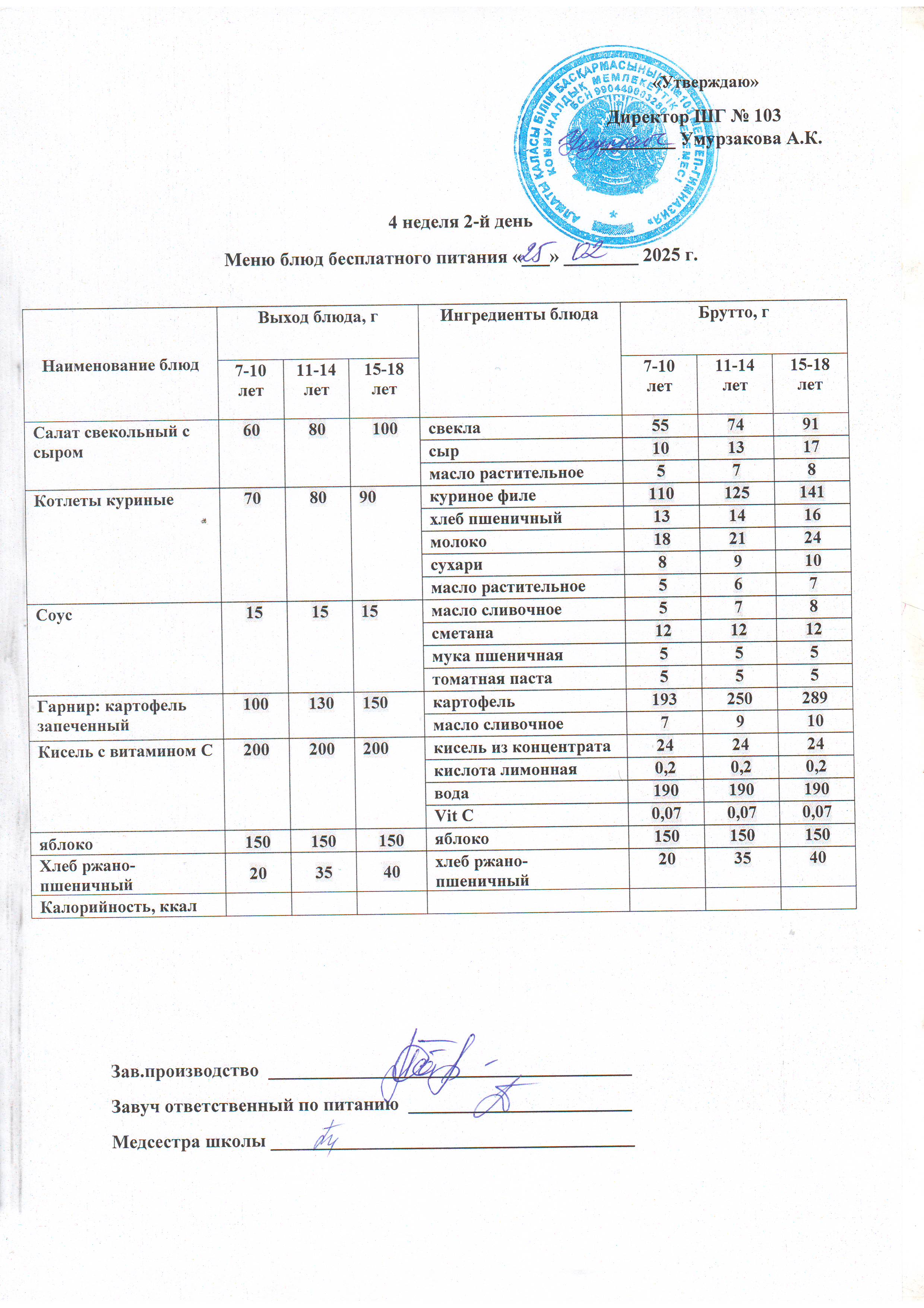 Сейсенбілік бақылау тамағы, ас мәзірі » КГУ "Школа-гимназия №103" Управления образования г.Алматы
