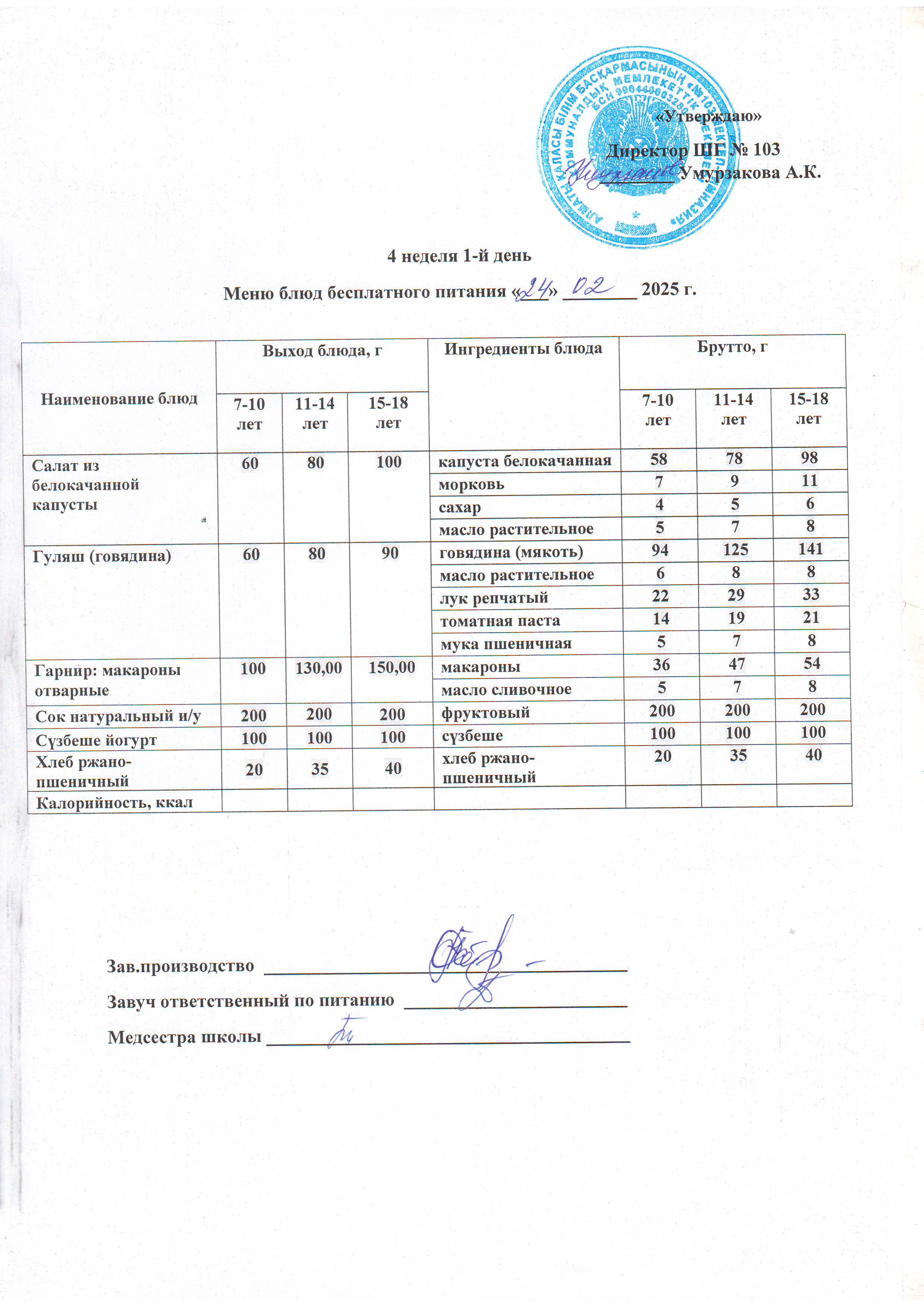Дүйсенбілік бақылау тамағы, ас мәзірі » КГУ "Школа-гимназия №103" Управления образования г.Алматы