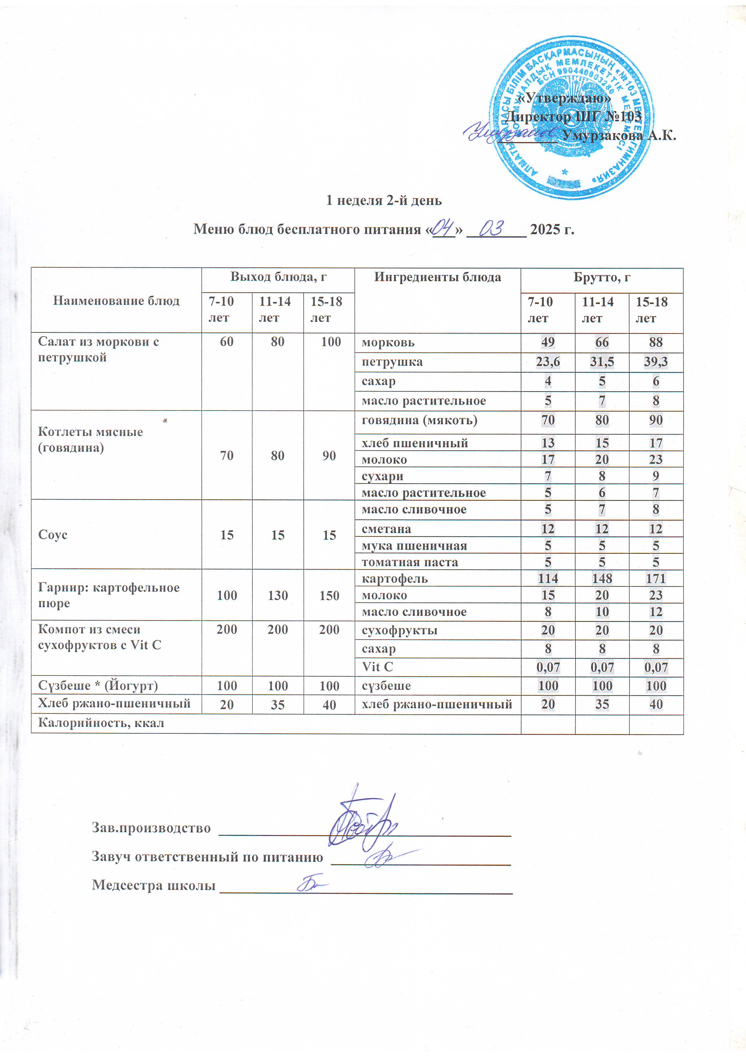 Сейсенбілік бақылау тамағы, ас мәзірі » КГУ "Школа-гимназия №103" Управления образования г.Алматы