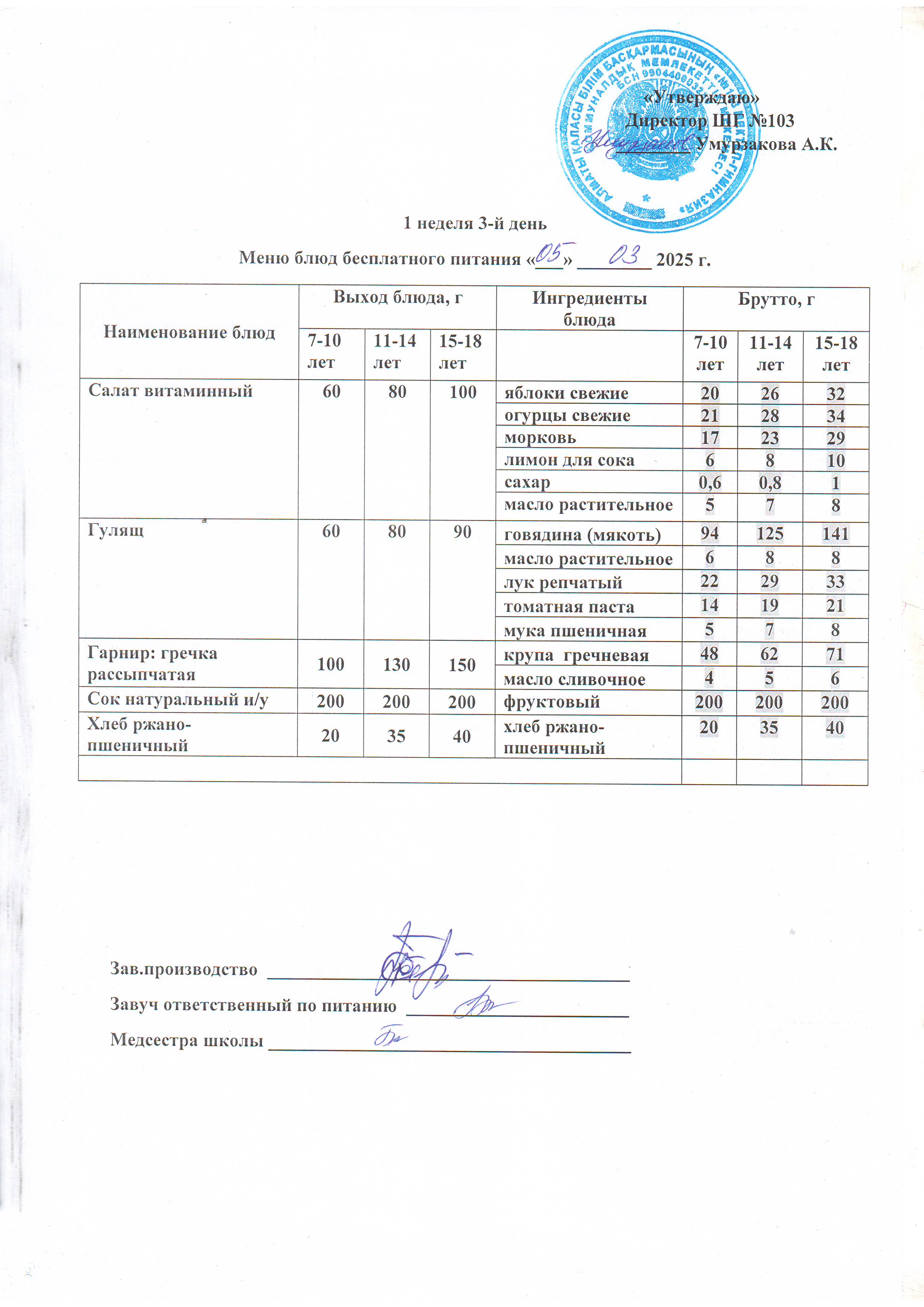 Сәрсенбілік бақылау асхана тағамдары, ас мәзірі » КГУ "Школа-гимназия №103" Управления образования г.Алматы