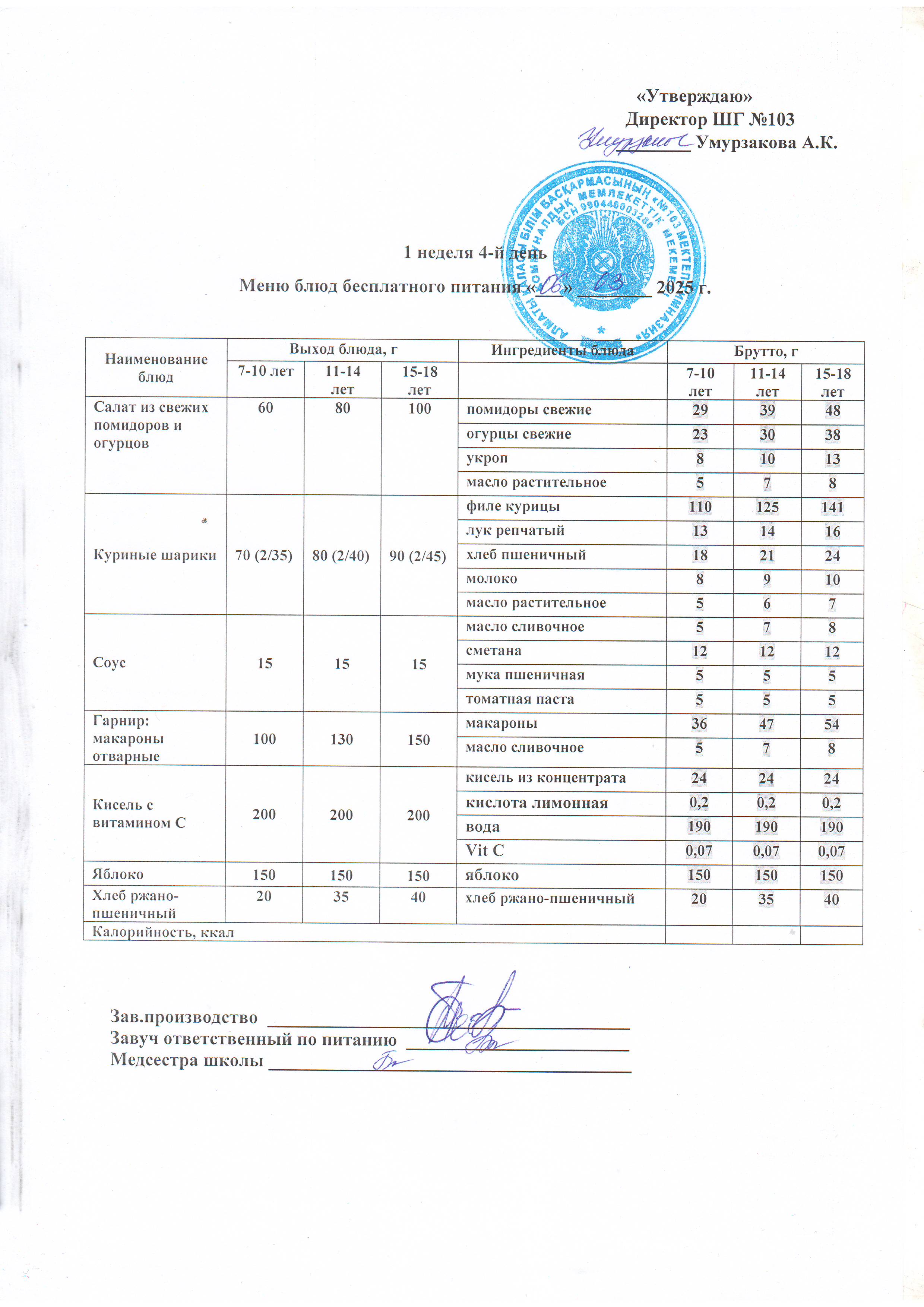 Бейсенбілік бақылау тағамы, ас мәзірі » КГУ "Школа-гимназия №103" Управления образования г.Алматы