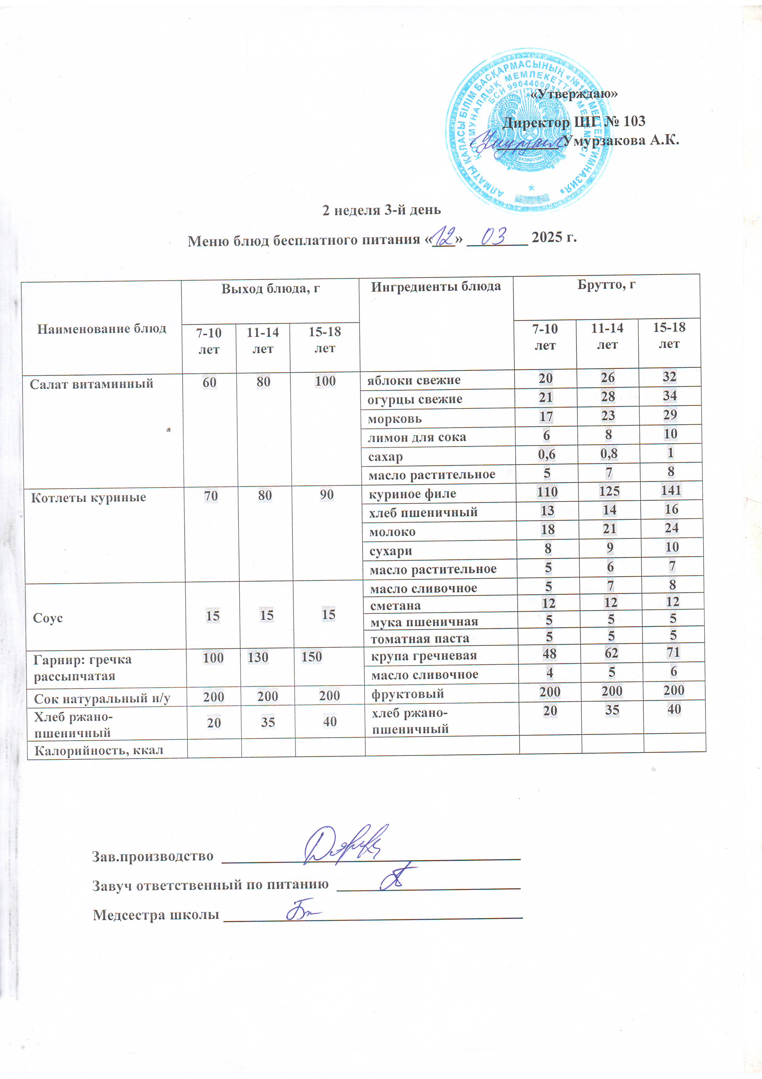 Сәрсенбілік бақылау тамағы, ас мәзірі » КГУ "Школа-гимназия №103" Управления образования г.Алматы