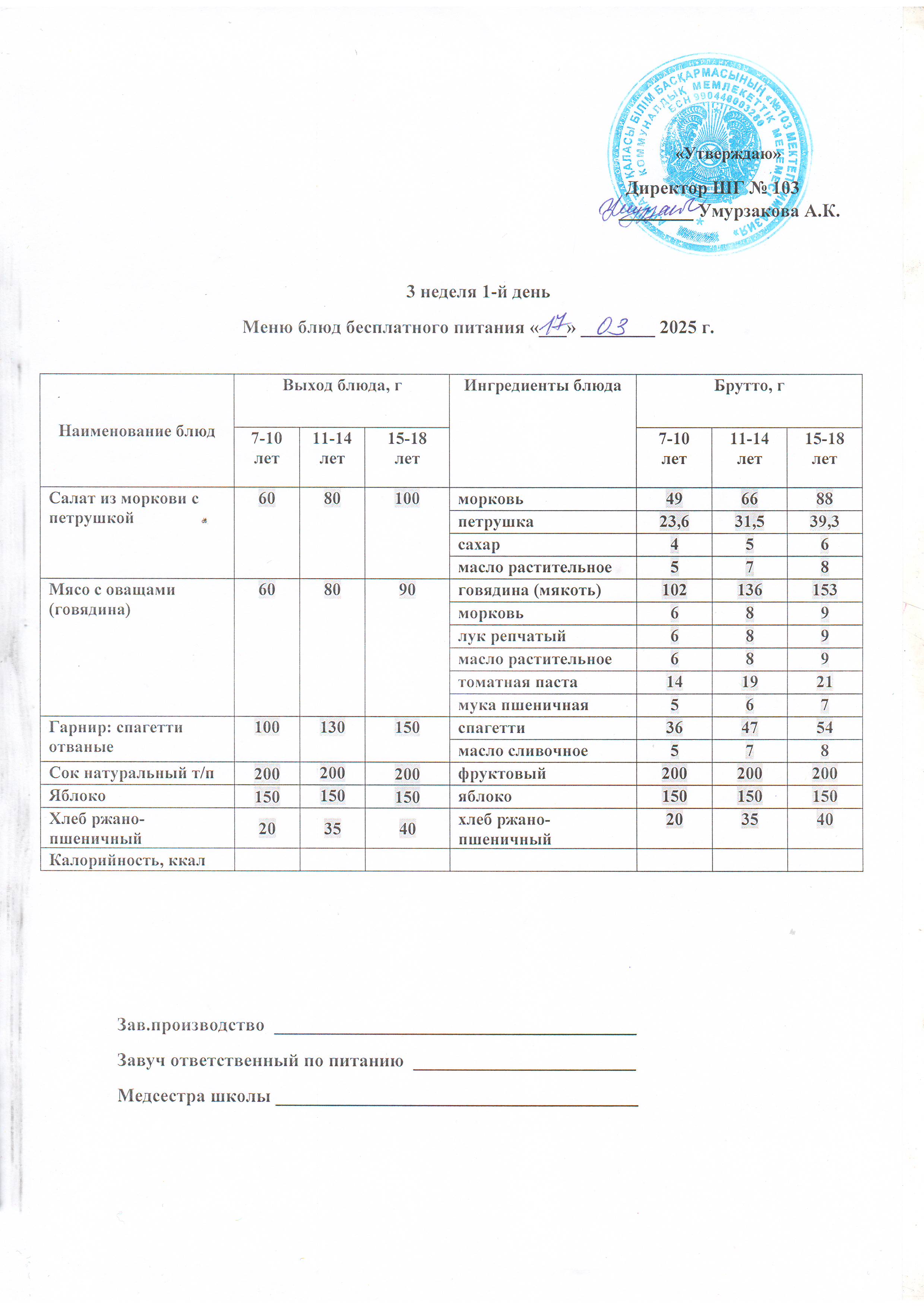 Дүйсенбілік бақылау тамағы, ас мәзірі » КГУ "Школа-гимназия №103" Управления образования г.Алматы