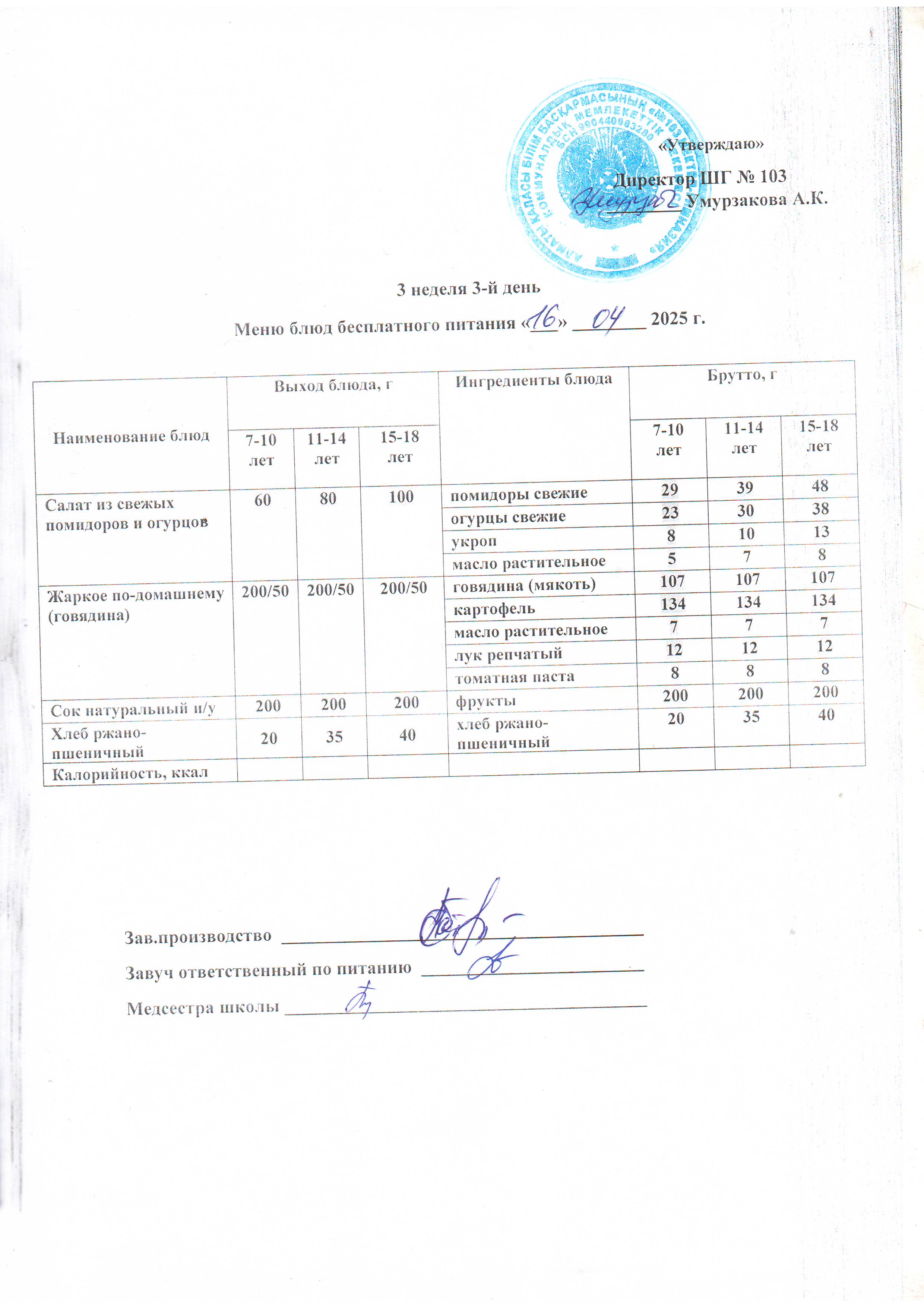 Ас мәзірі 16.04.2025 » КГУ "Школа-гимназия №103" Управления образования г.Алматы