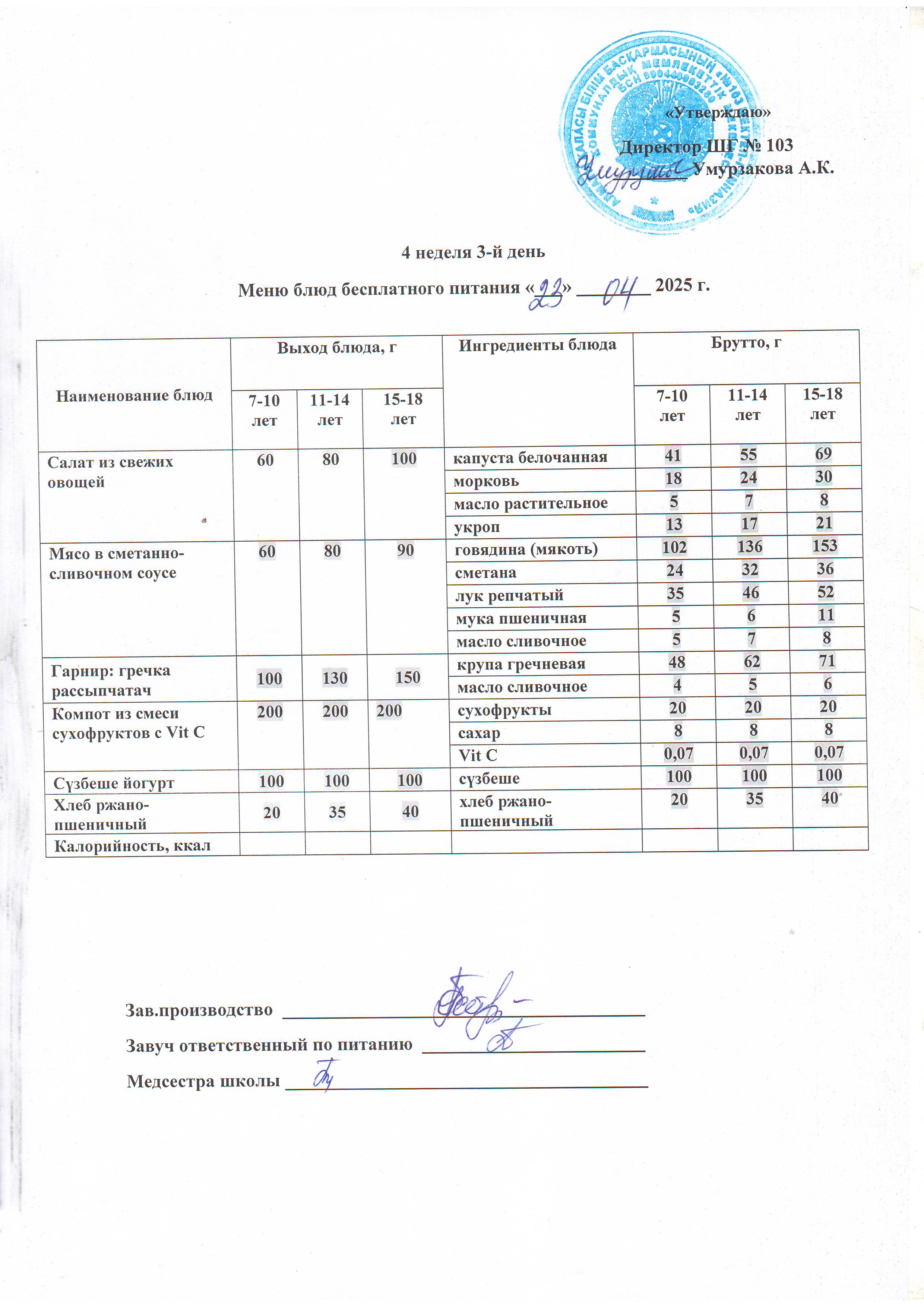 Сәрсенбілік ас мәзірі, бақылау тамағы 23.04.2025 » КГУ "Школа-гимназия №103" Управления образования г.Алматы