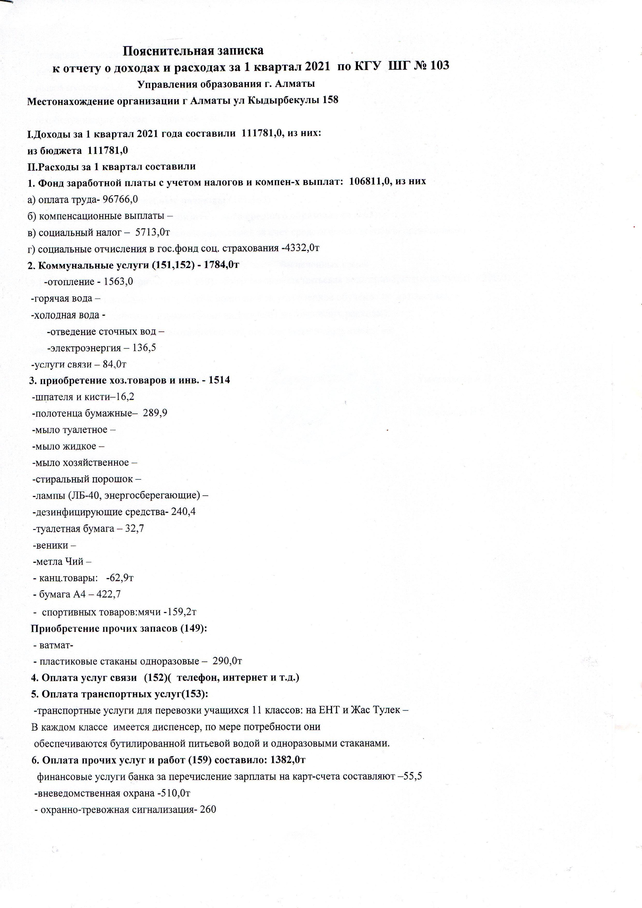 Отчет о доходах и расходах за 1 квартал 2021 года » КГУ "Школа-гимназия №103" Управления образования г.Алматы