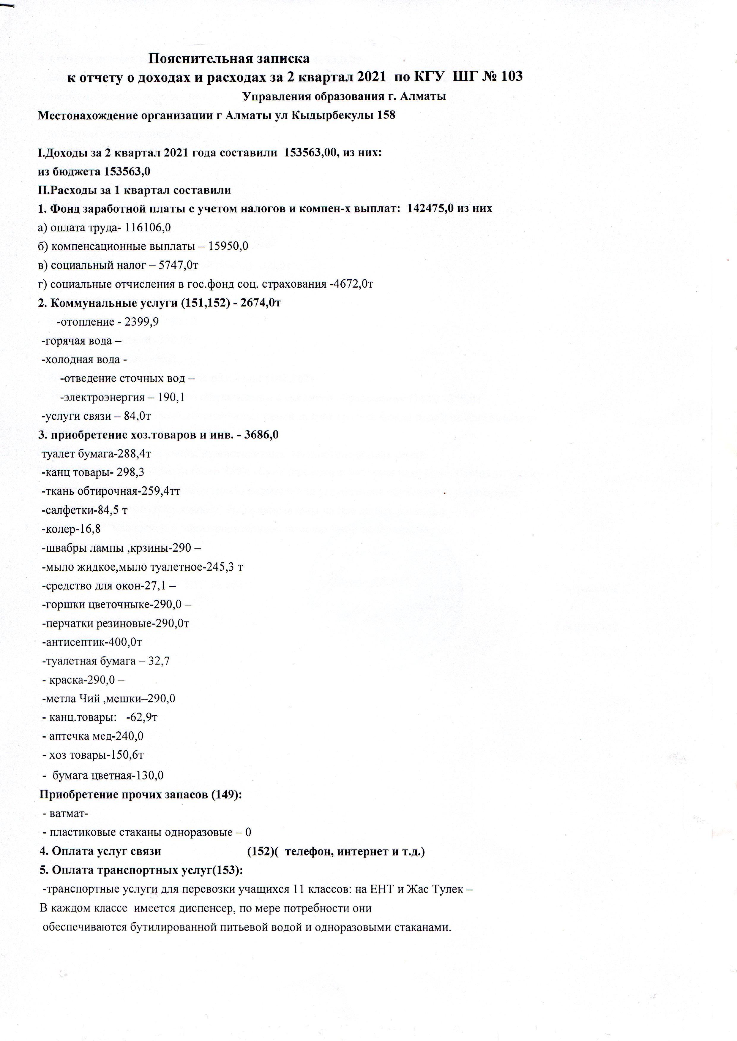 Отчет о доходах и расходах за 2 квартал 2021 года » КГУ "Школа-гимназия №103" Управления образования г.Алматы