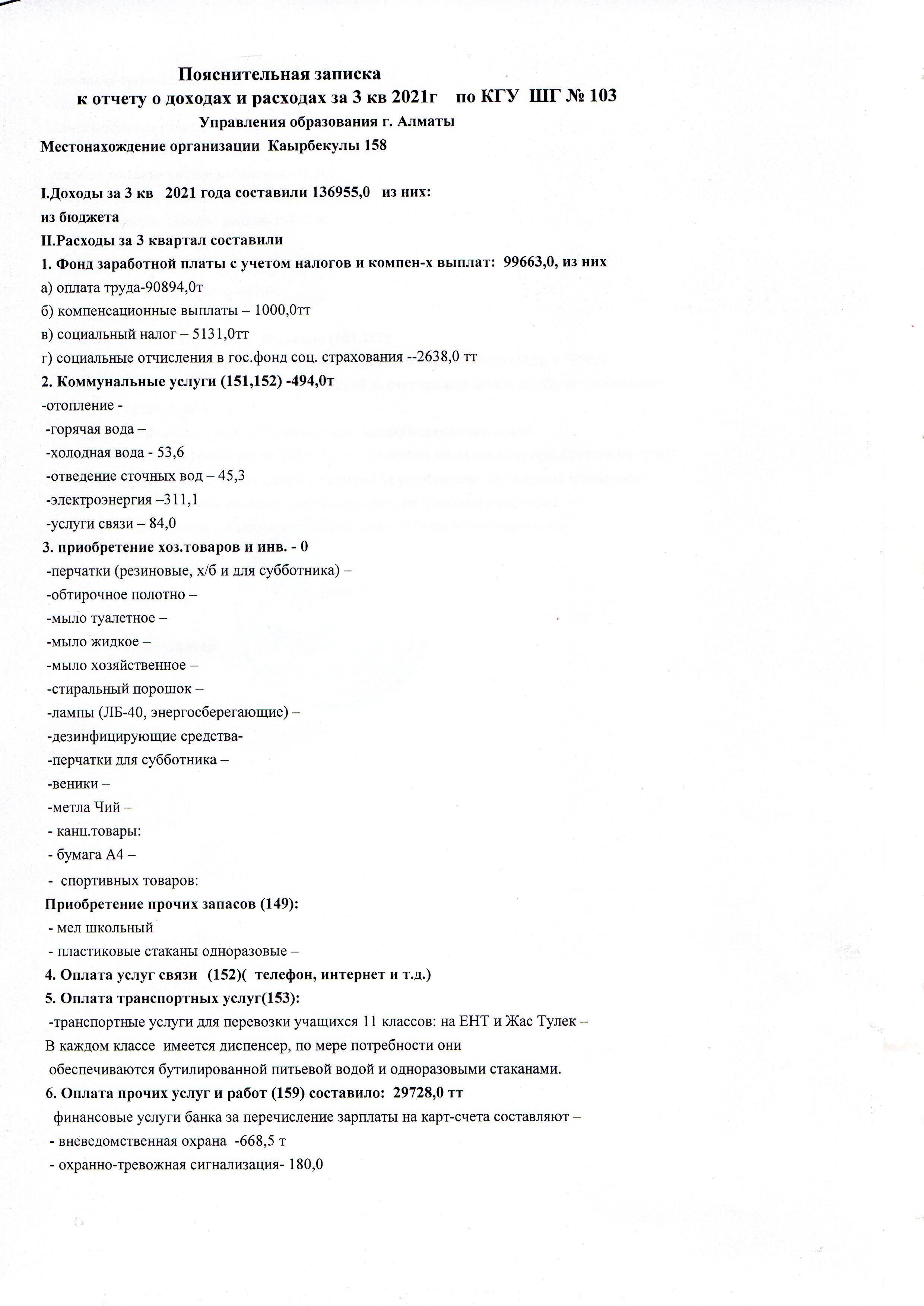 Отчет о доходах и расходах за 3 квартал 2021 года » КГУ "Школа-гимназия №103" Управления образования г.Алматы