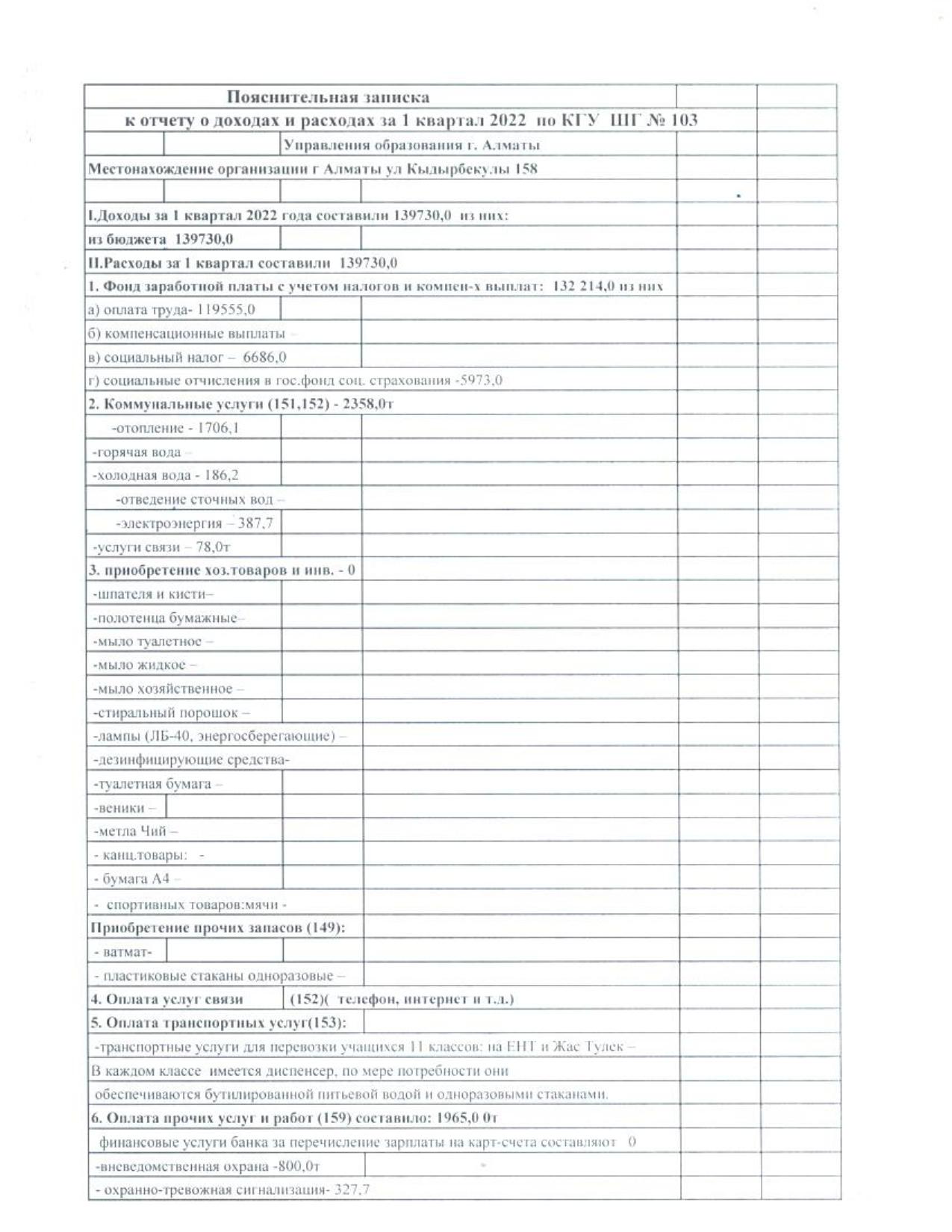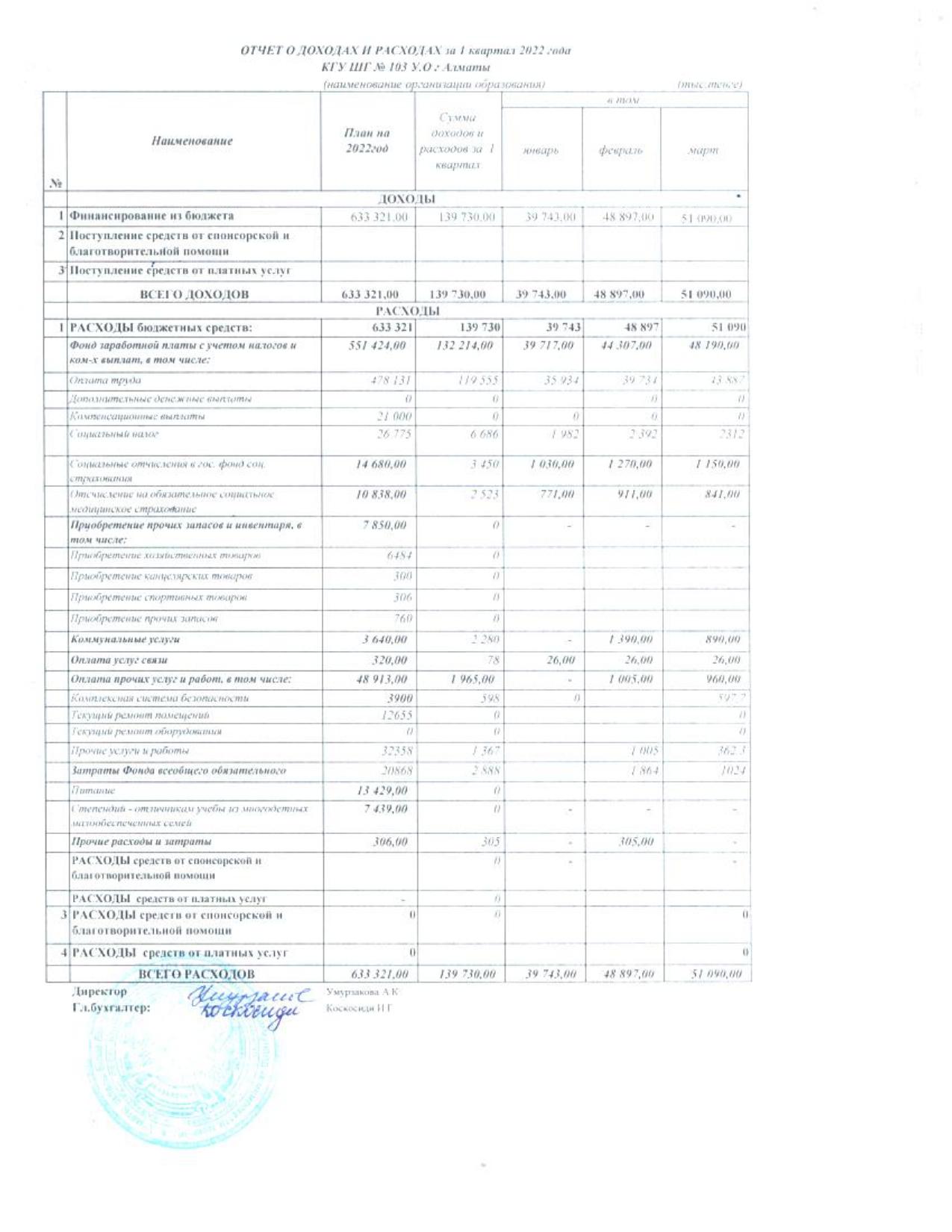 Отчет о доходах и расходах за 1 квартал 2022 года » КГУ "Школа-гимназия №103" Управления образования г.Алматы