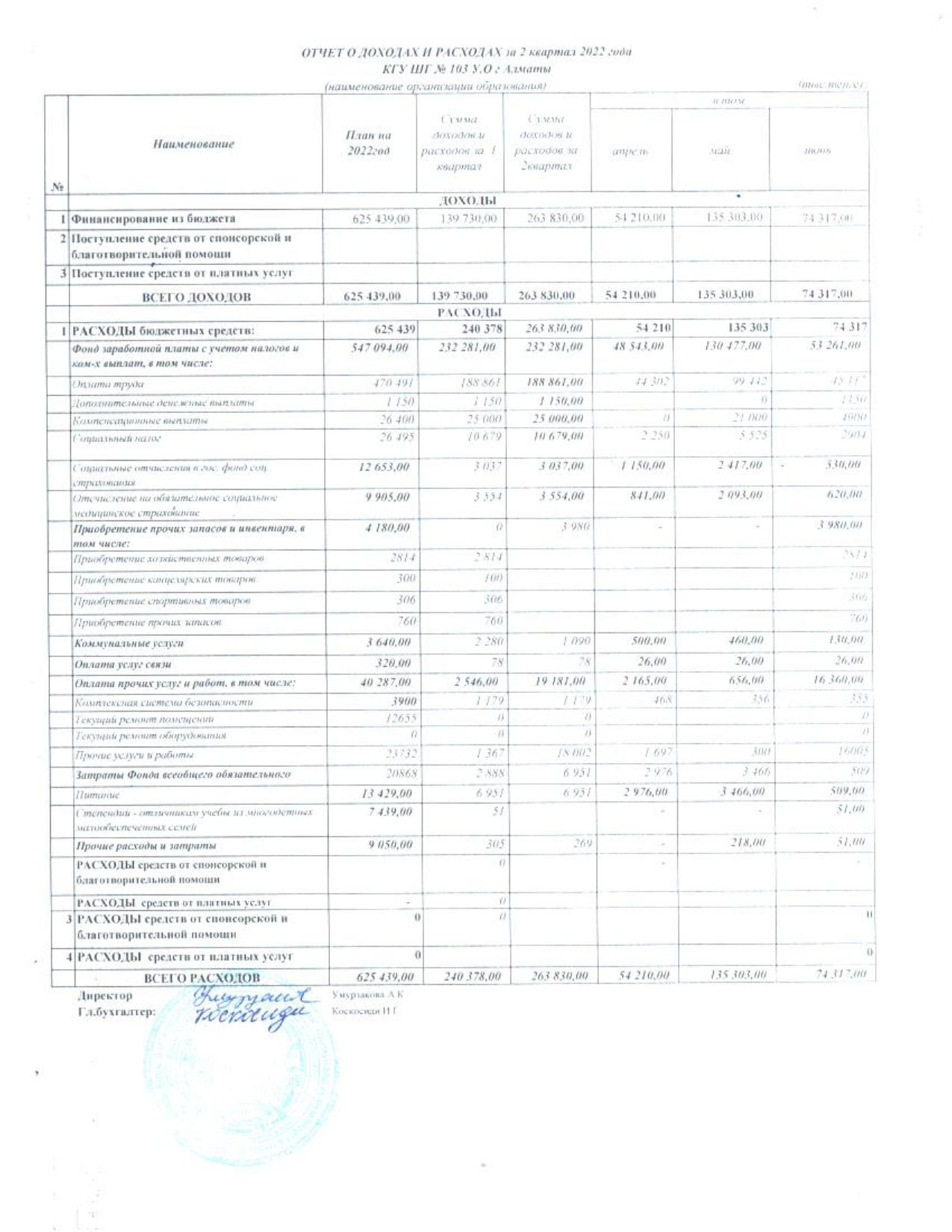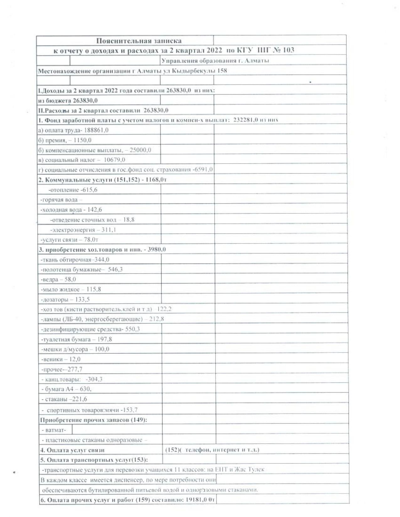 Отчет о доходах и расходах за 2 квартал 2022 года » КГУ "Школа-гимназия №103" Управления образования г.Алматы