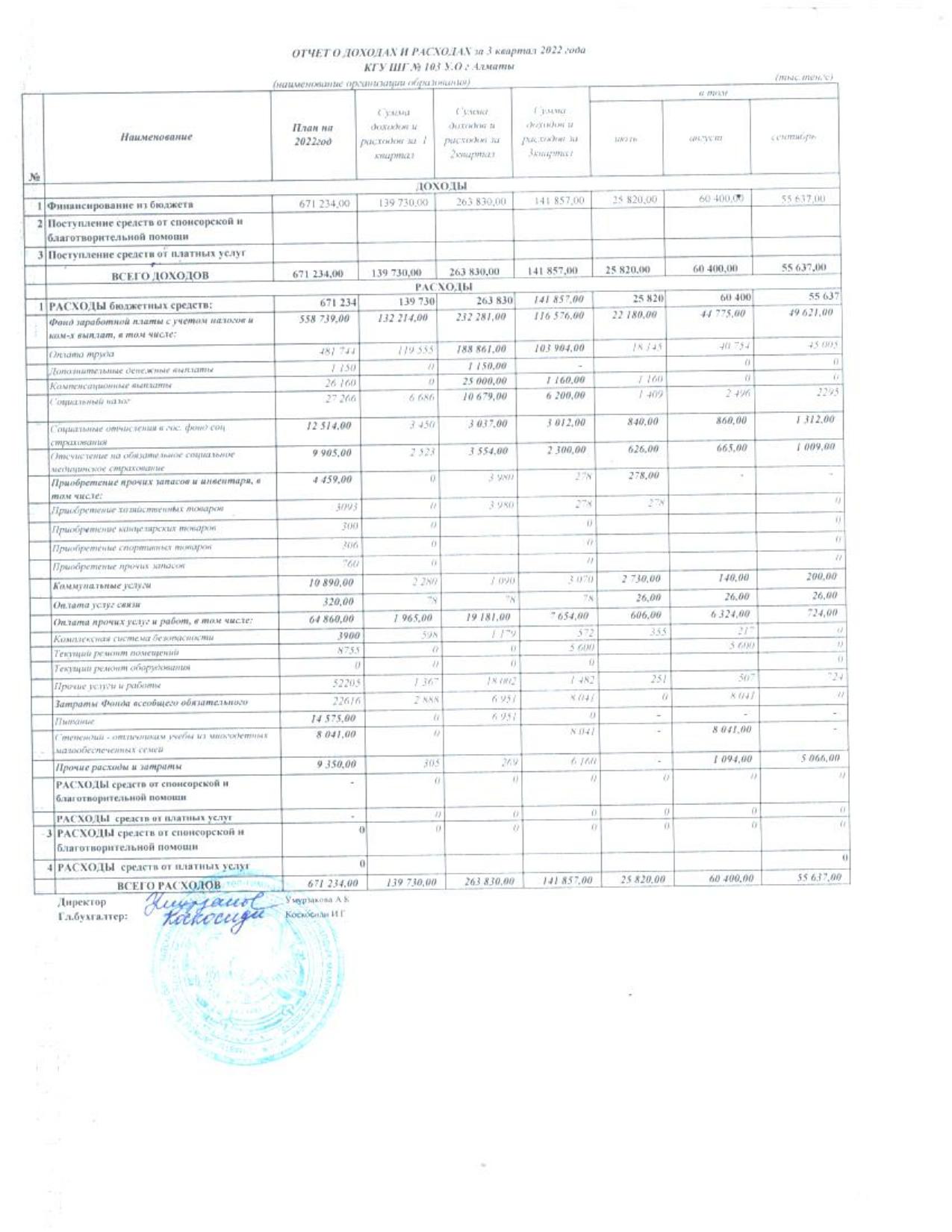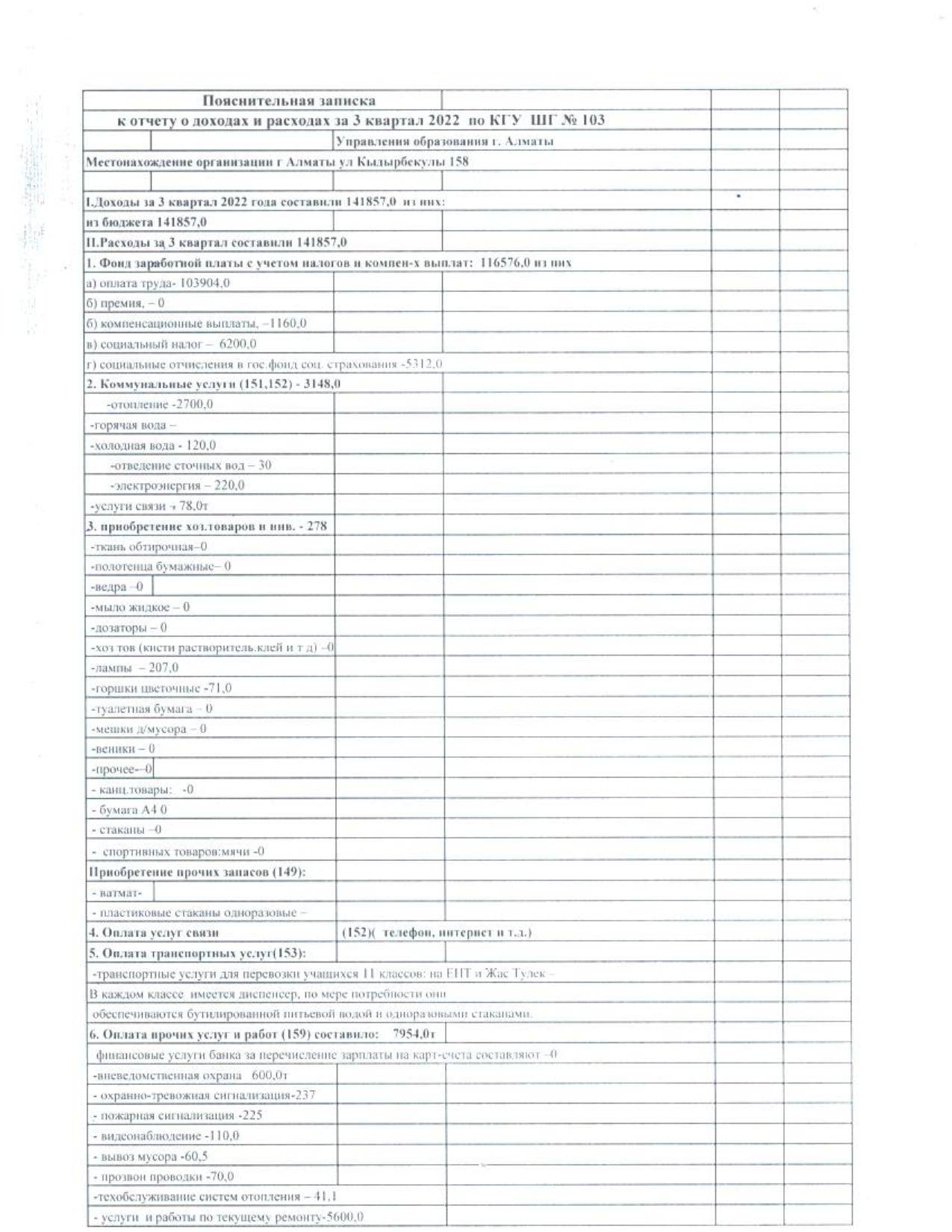 Отчет о доходах и расходах за 3 квартал 2022 года » КГУ "Школа-гимназия №103" Управления образования г.Алматы