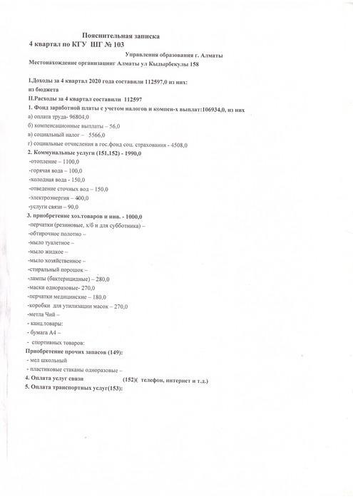 Отчет о доходах и расходах за 4 квартал 2020 года КГУ ШГ №103 » КГУ "Школа-гимназия №103" Управления образования г.Алматы