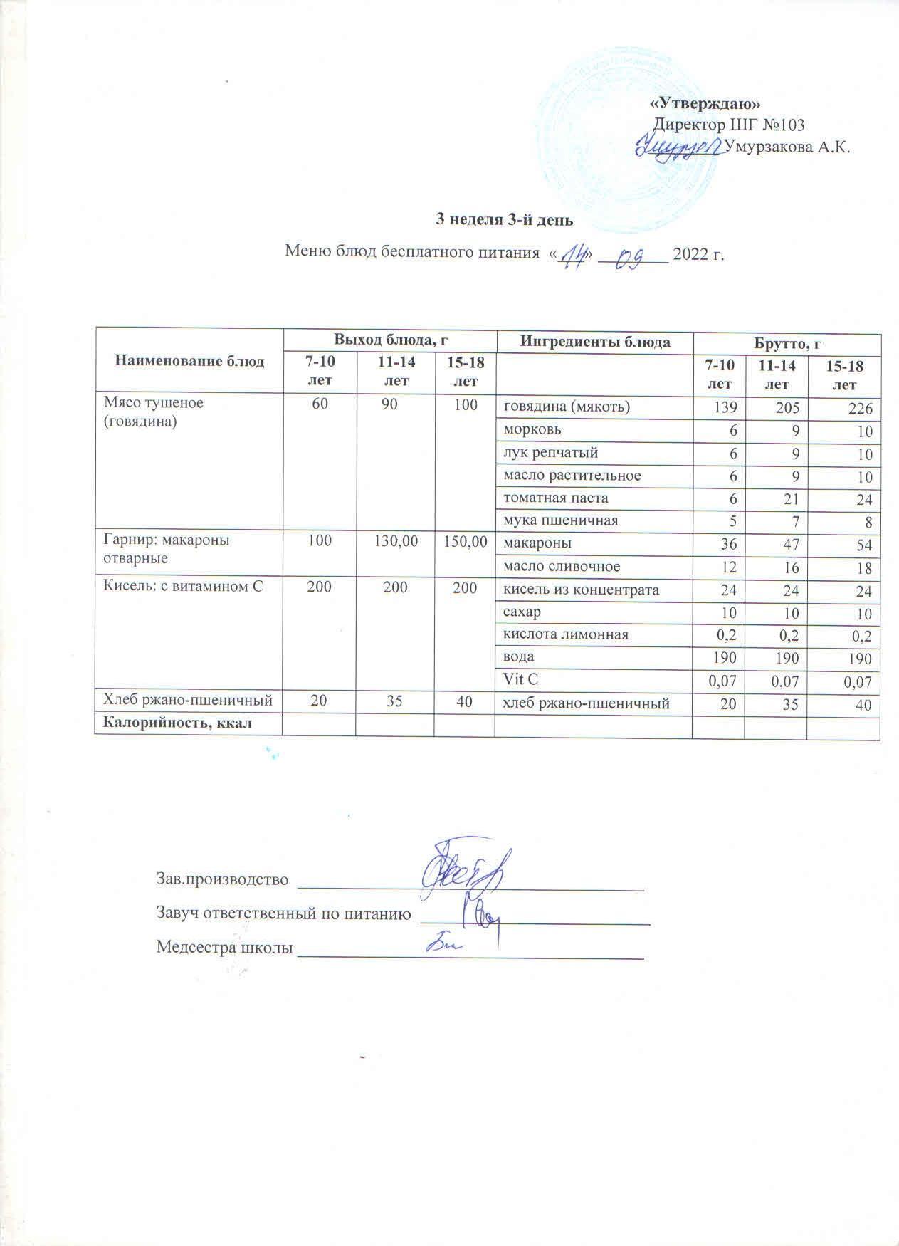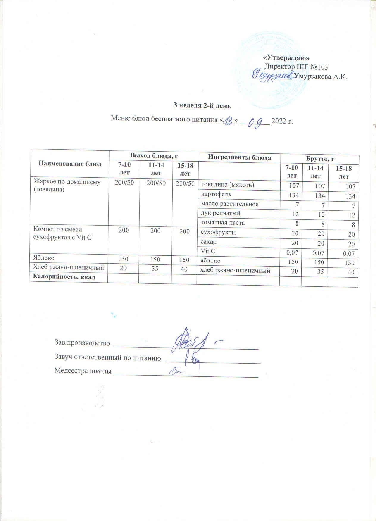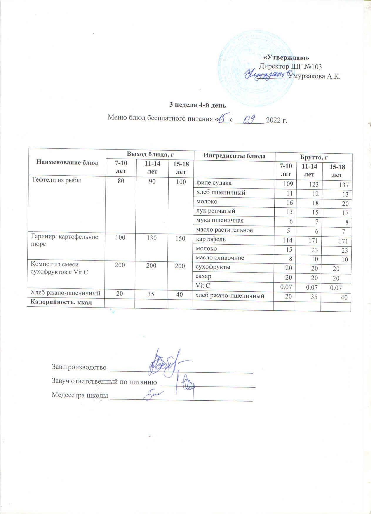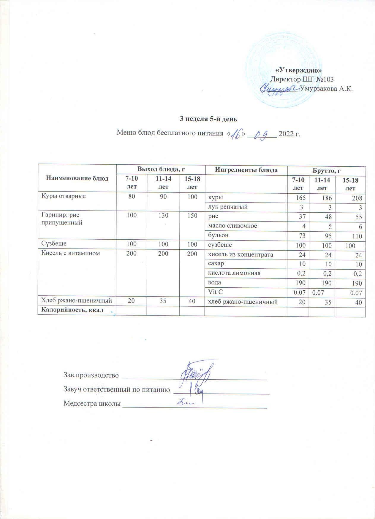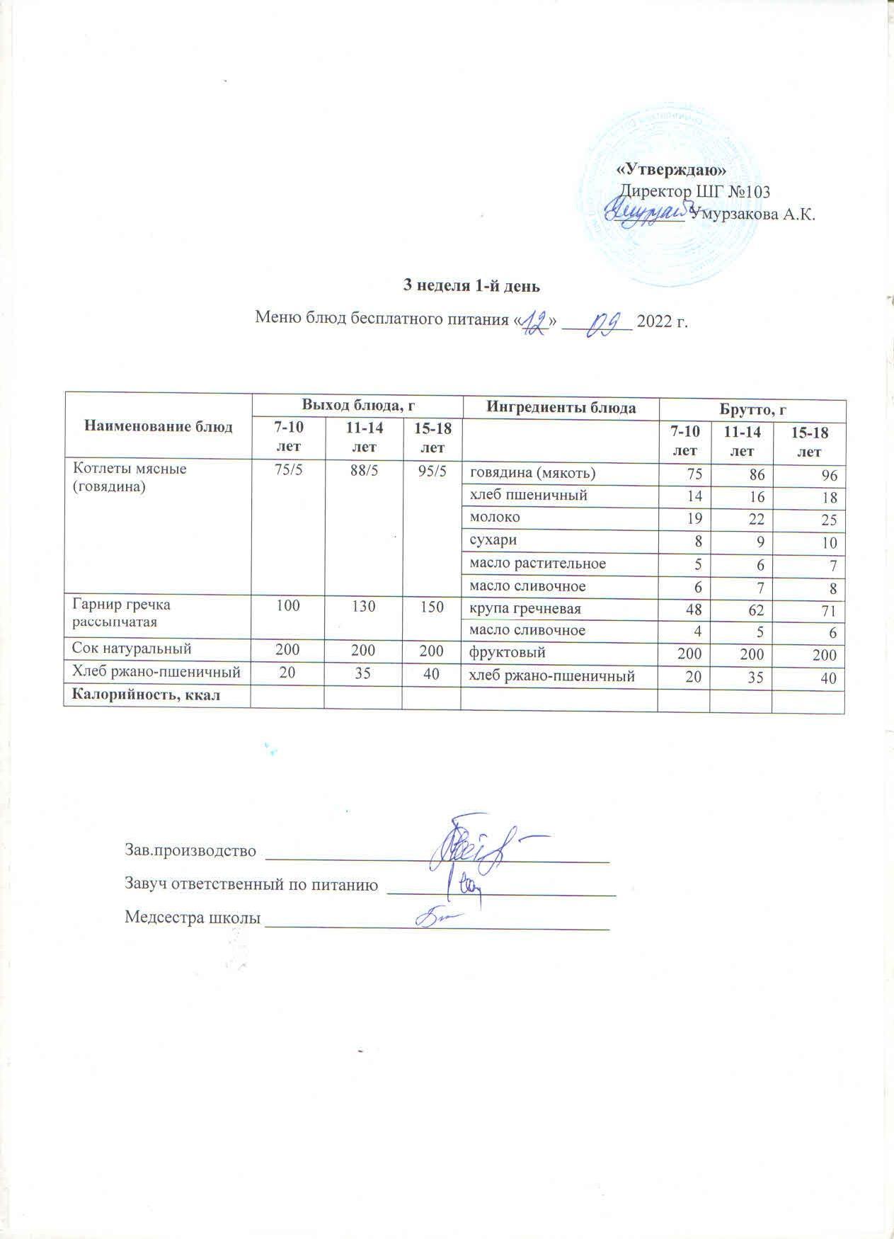 Тегін тамақтануға арналған ас мәзірі » КГУ "Школа-гимназия №103" Управления образования г.Алматы