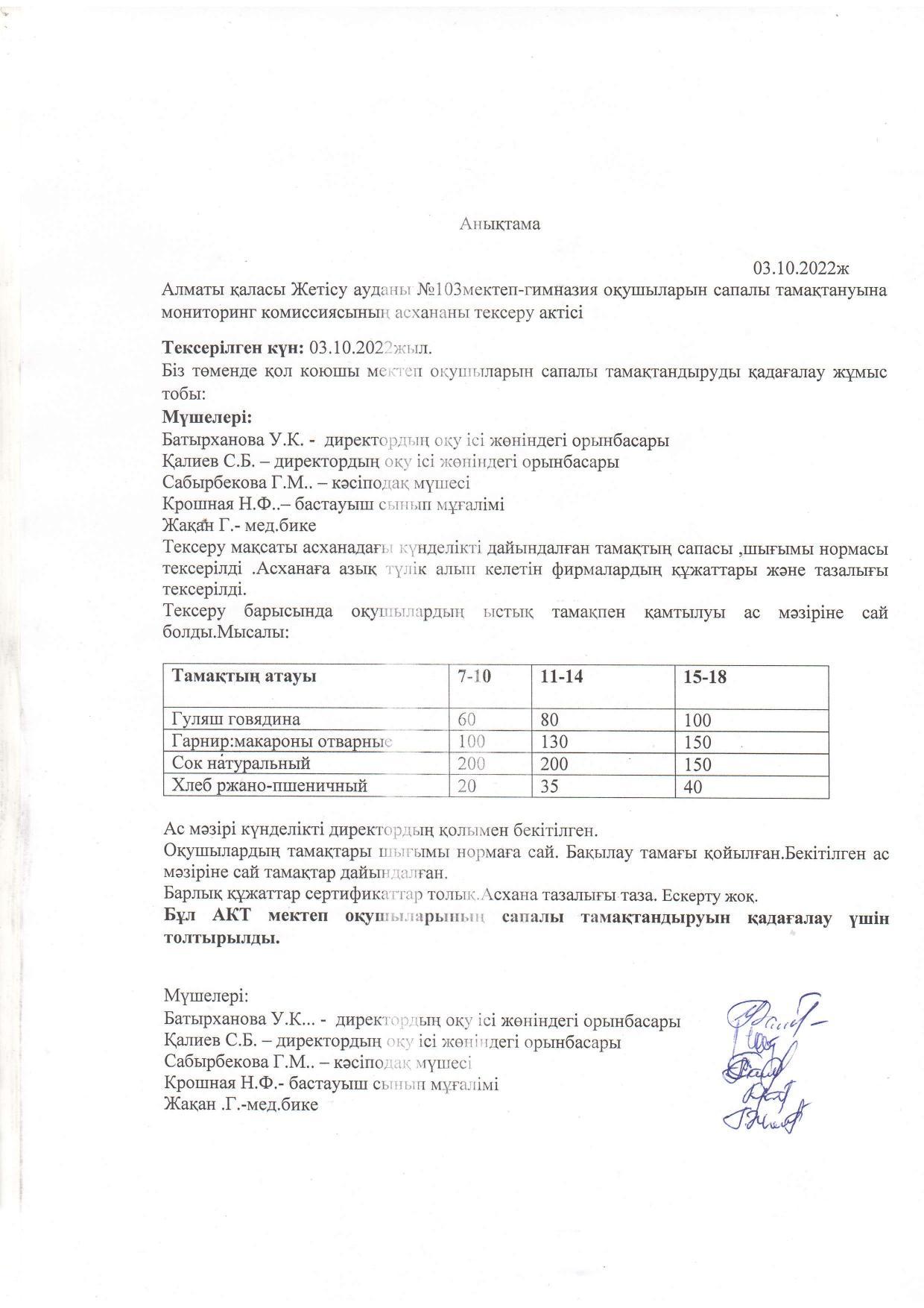 Мониторинг комиссиясының асхананы тексеру актісі » КГУ "Школа-гимназия №103" Управления образования г.Алматы