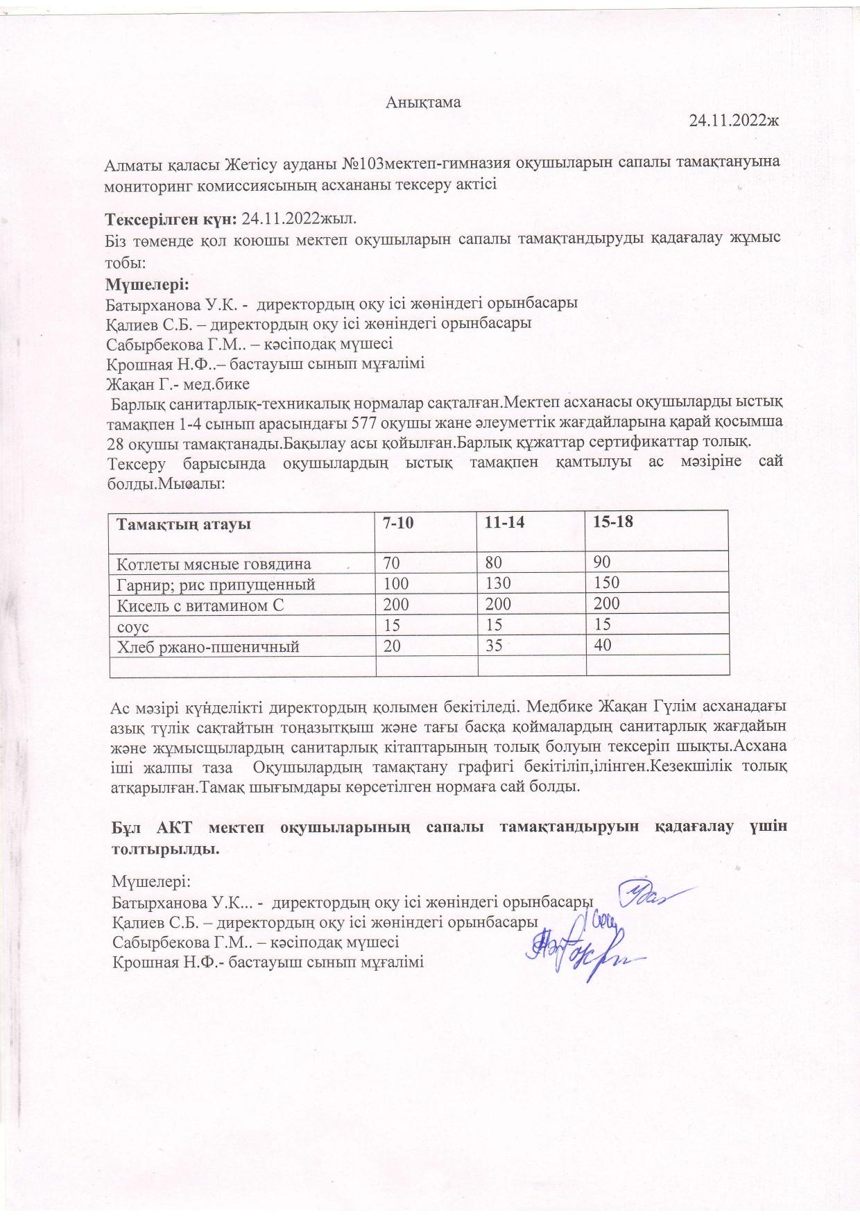 Мониторинг комиссиясының асхананы тексеру актісі » КГУ "Школа-гимназия №103" Управления образования г.Алматы