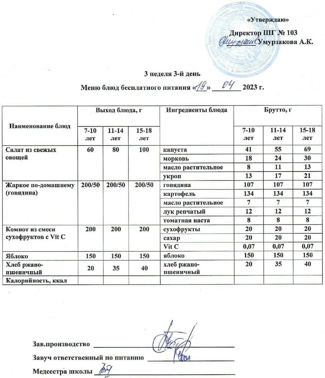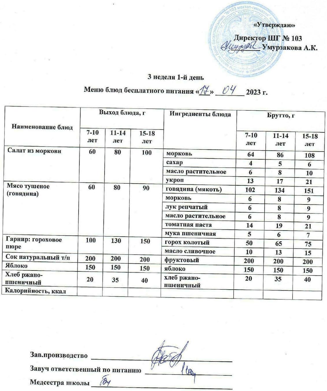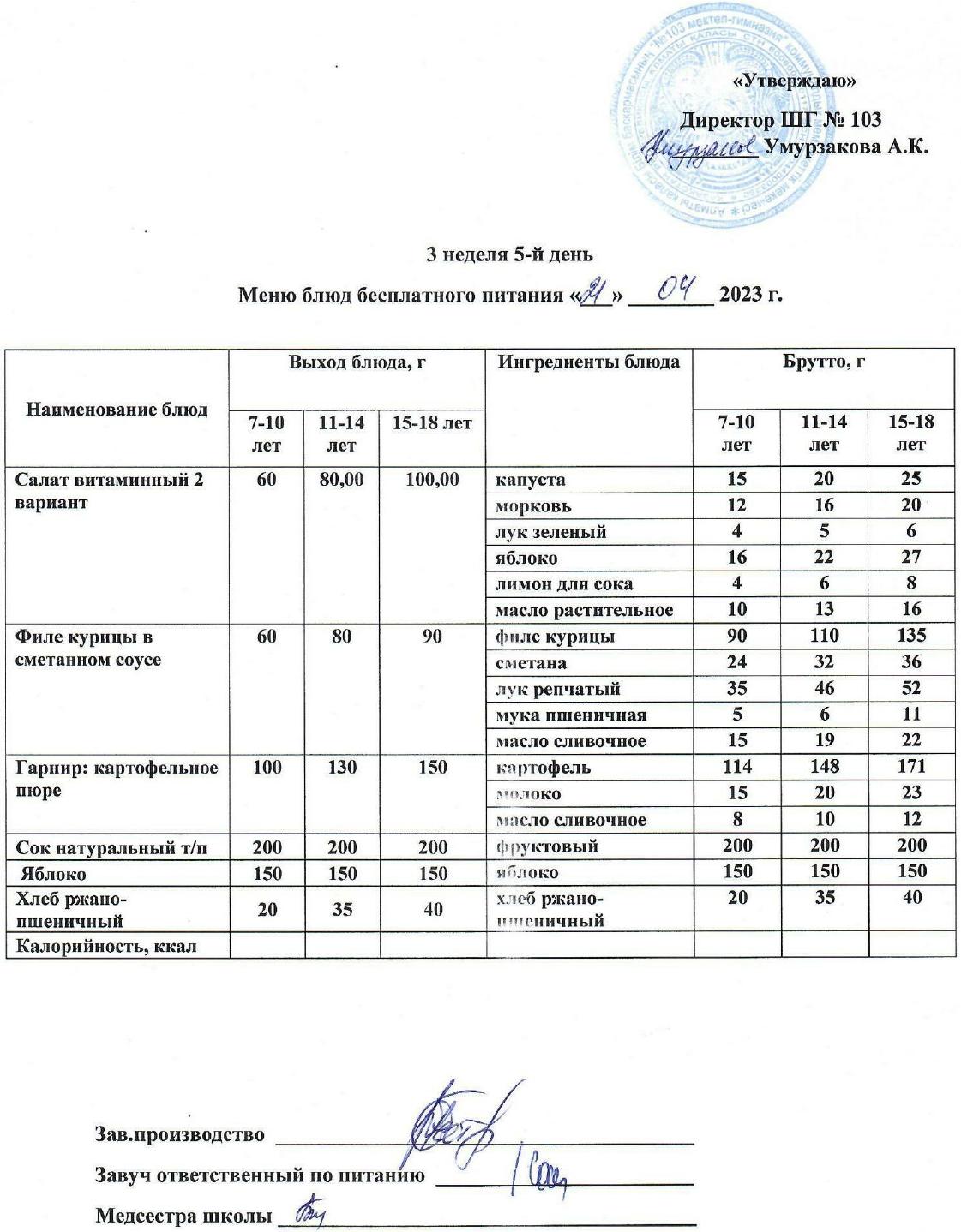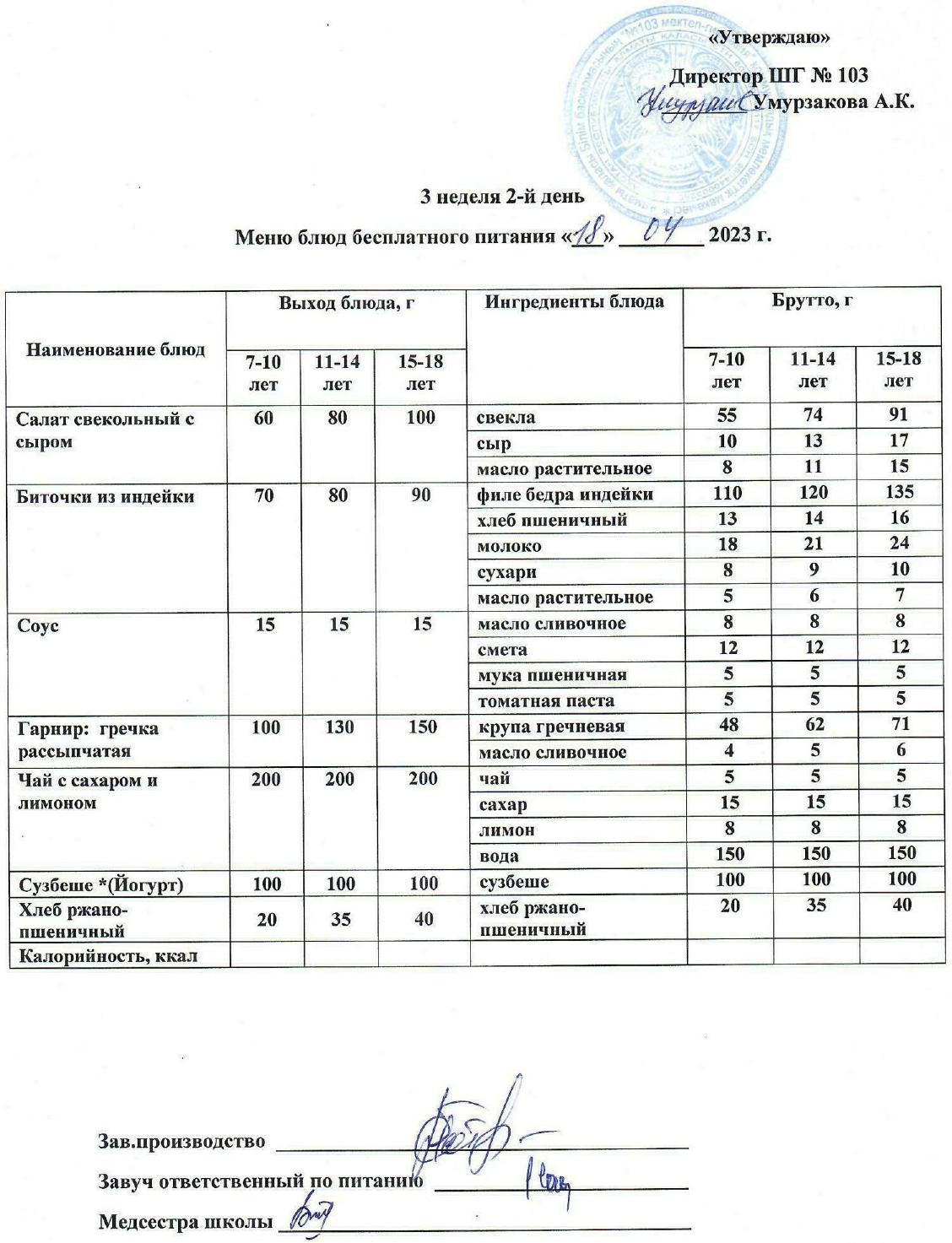 1 апталық ас мәзірі » КГУ "Школа-гимназия №103" Управления образования г.Алматы