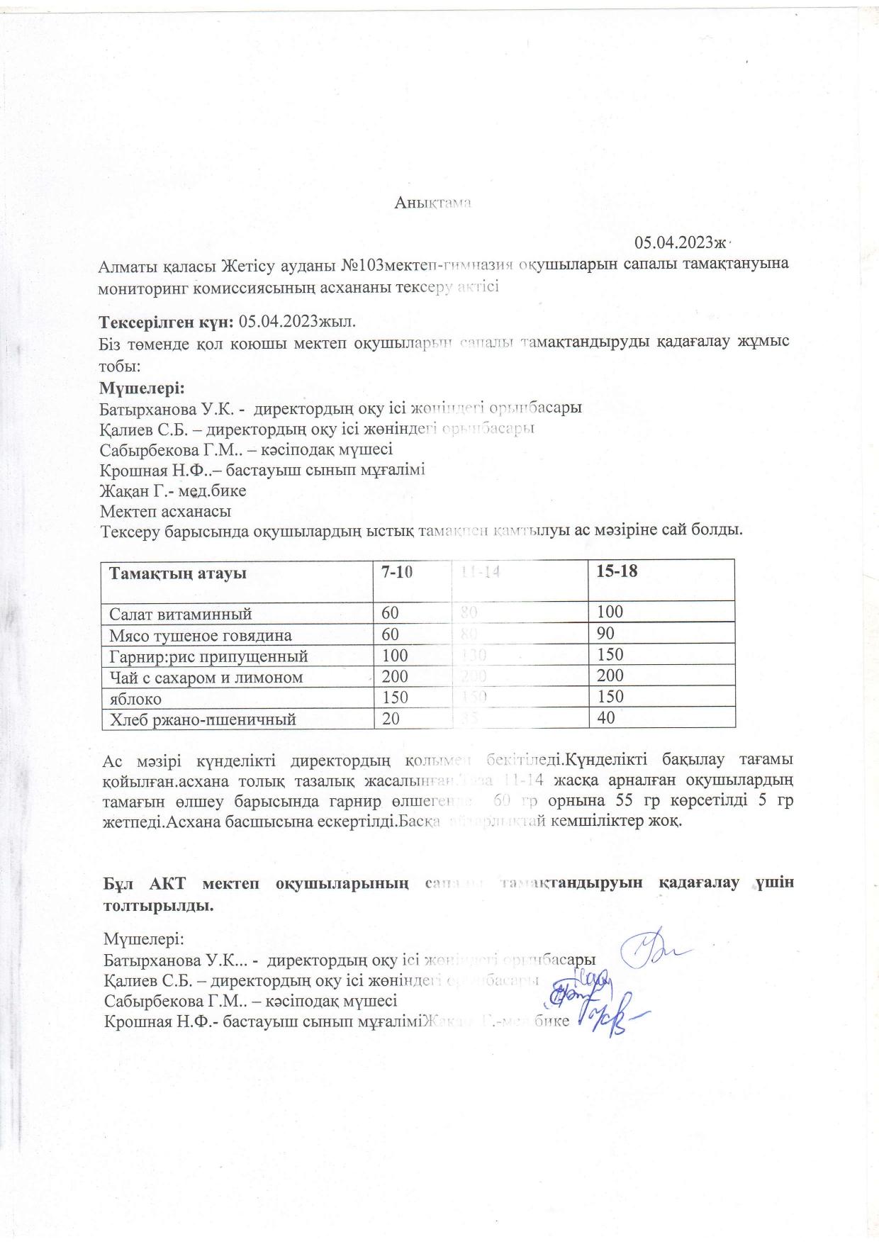 05 сәуір 2023 0 1 2 3 4 5 Оқушылардың сапалы тамақтануына мониторинг комиссиясының асхананы тексеру актісі
