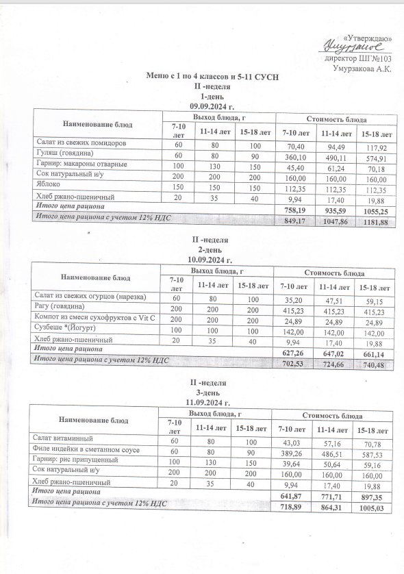 1 апталық ас мәзірі » КГУ "Школа-гимназия №103" Управления образования г.Алматы
