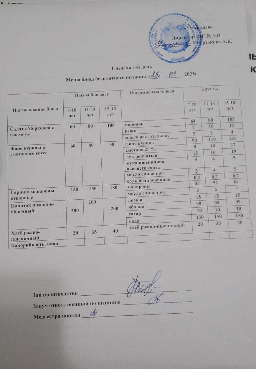29.09.2025 жыл ас мәзірі, бақылау тамағы » КГУ "Школа-гимназия №103" Управления образования г.Алматы