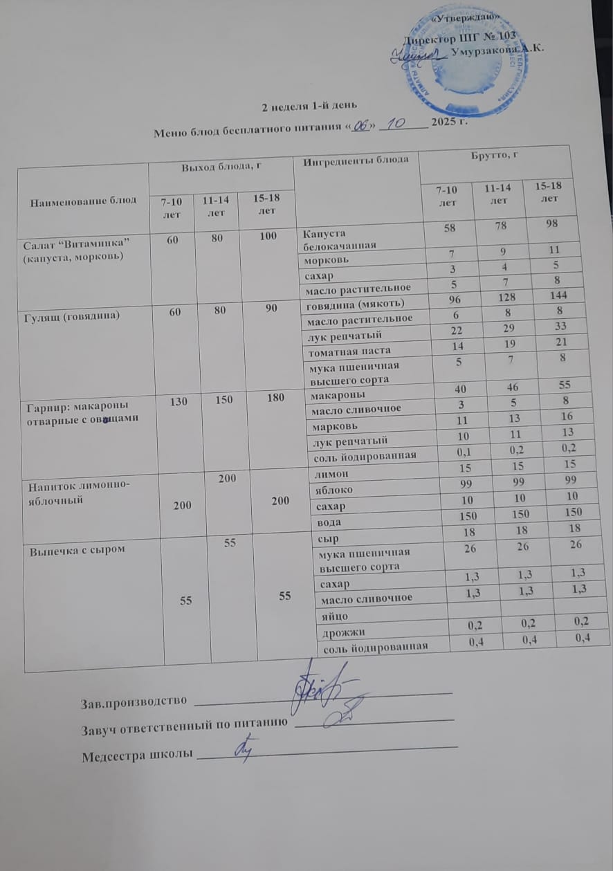 06.10.2025 жыл ас мәзірі, бақылау тамағы » КГУ "Школа-гимназия №103" Управления образования г.Алматы