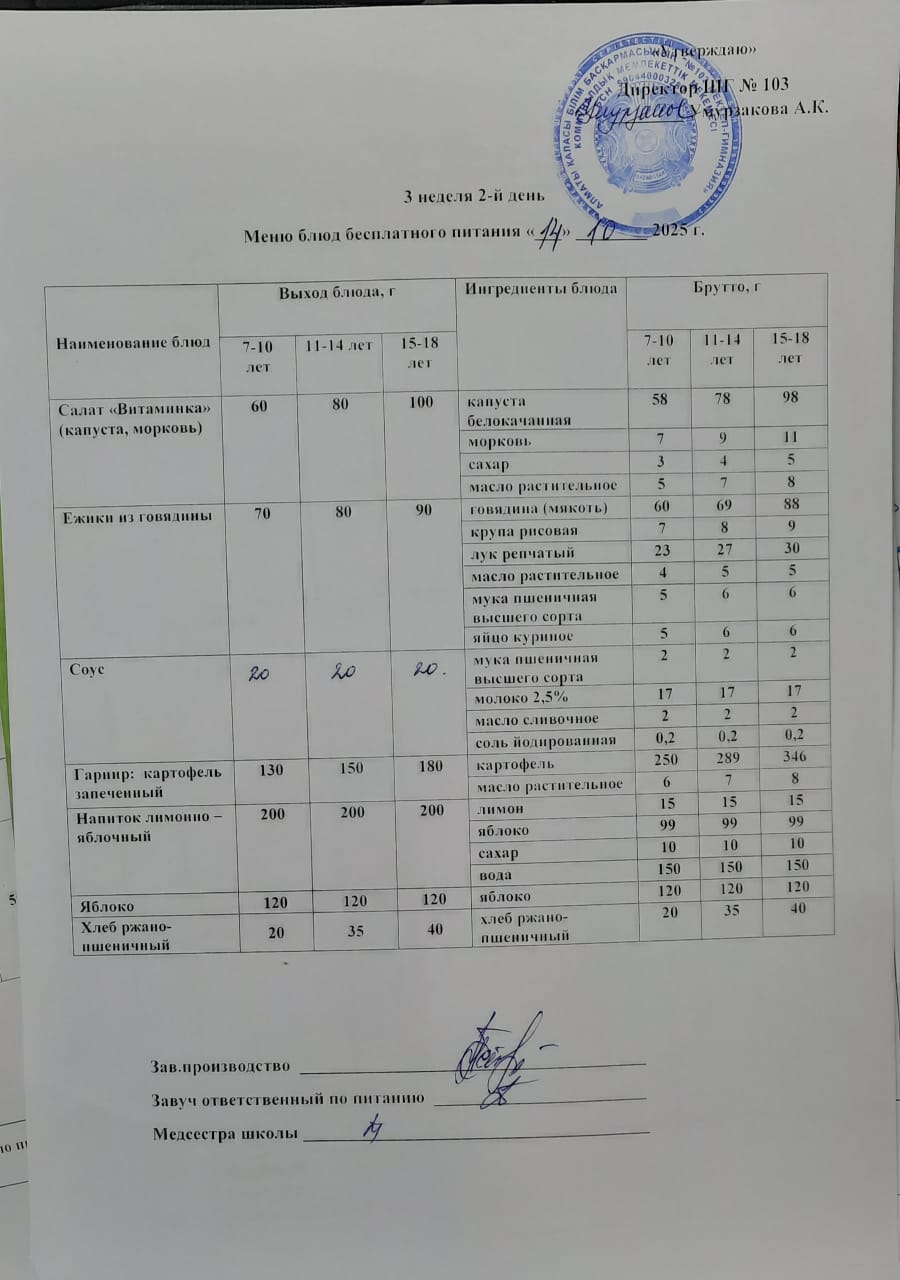 14.10.2025 жылы Ас мәзірі, бақылау тамағы » КГУ "Школа-гимназия №103" Управления образования г.Алматы