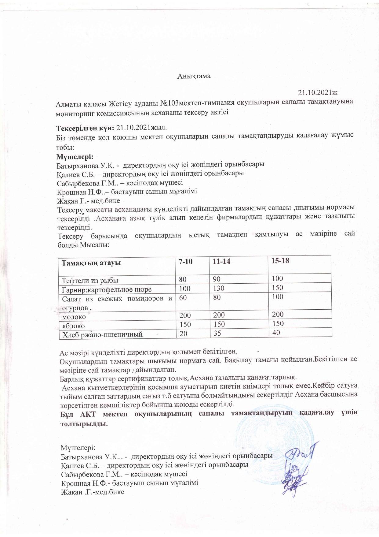 Мониторинг комиссиясының асхананы тексеру актісі » КГУ "Школа-гимназия №103" Управления образования г.Алматы