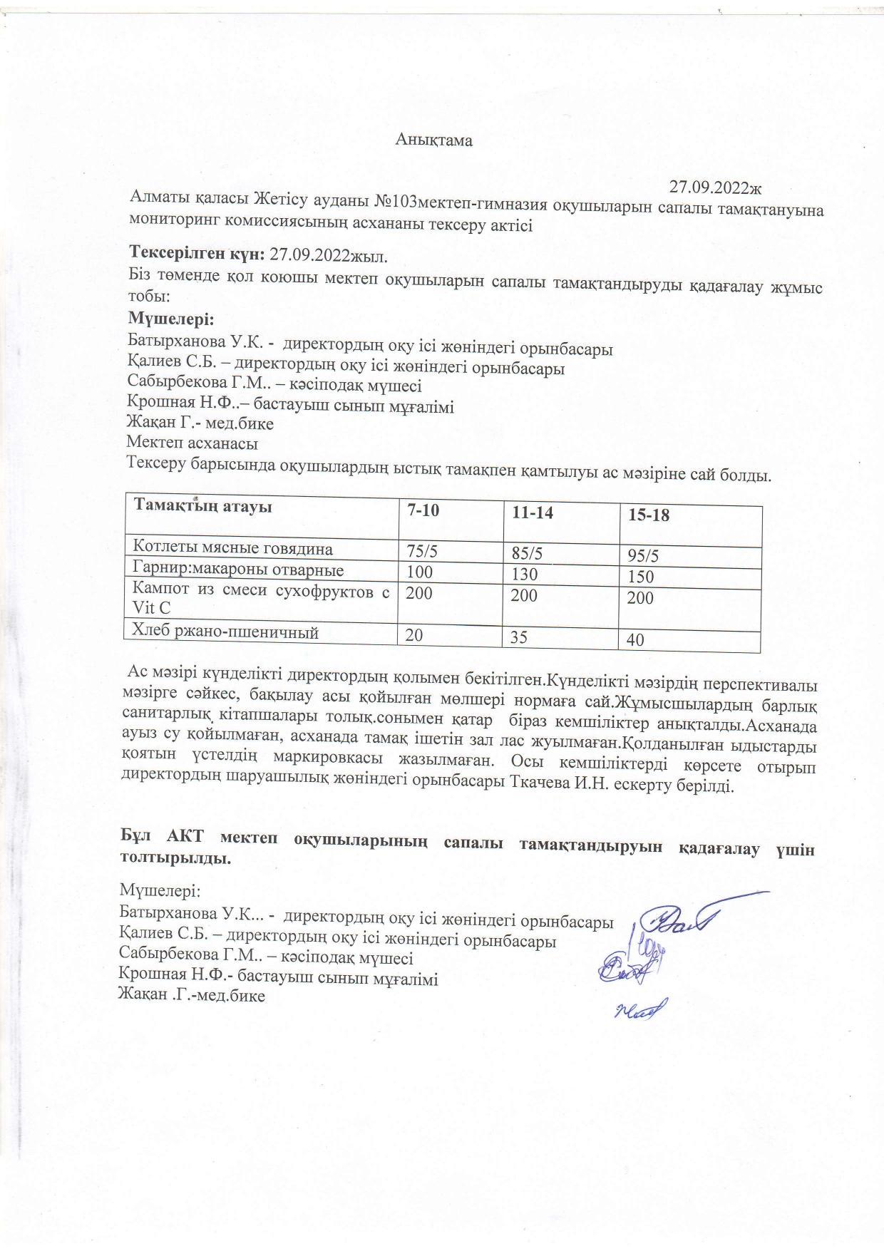 27 қыркүйек 2022 0 1 2 3 4 5 Мектеп оқушыларының сапалы тамақтануына мониторинг комиссиясының асхана тексеру актісі